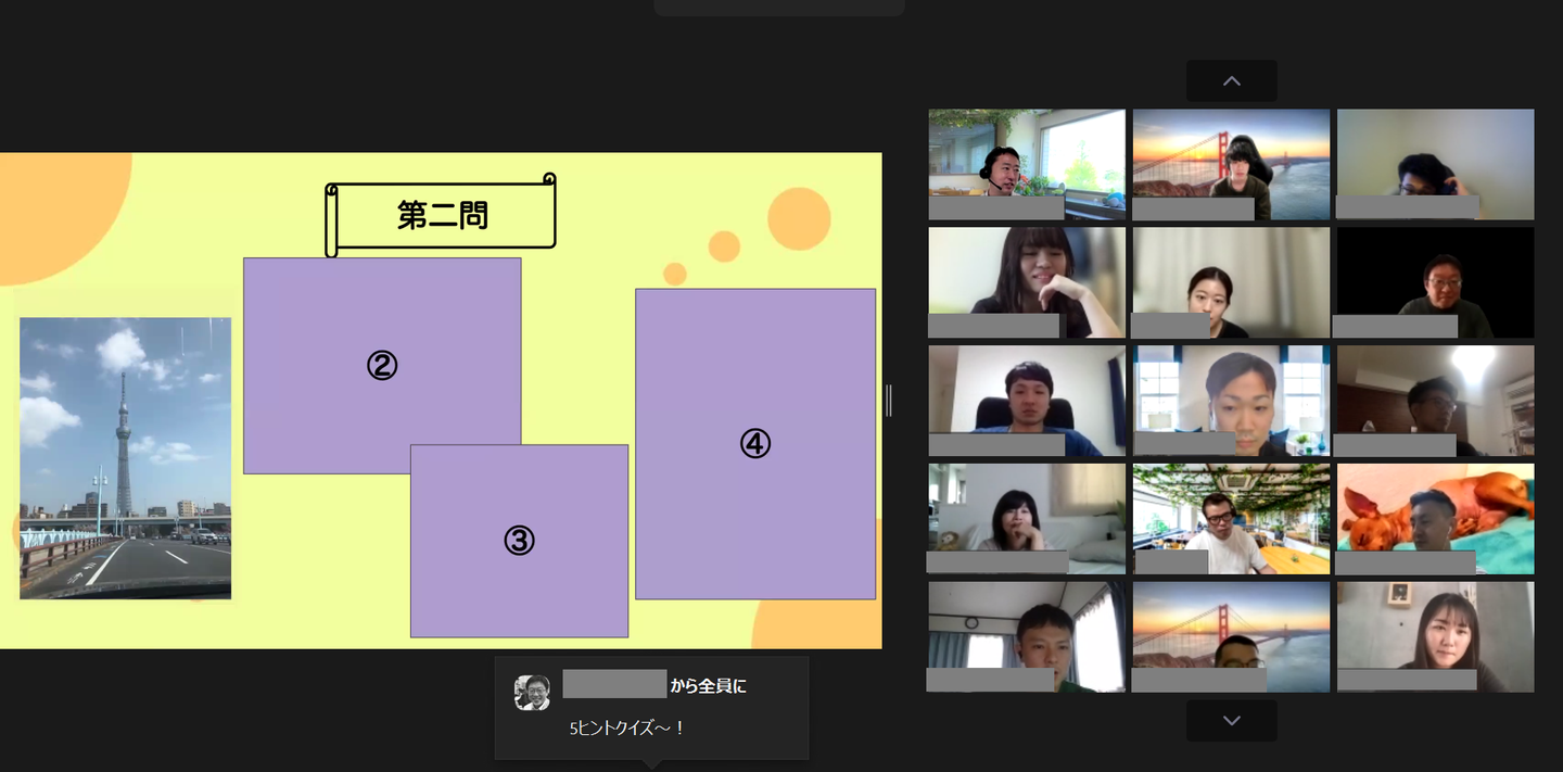 2021年新卒の3人が企画してくれたコンテンツ。企画メンバーがどんどんクイズを出し、参加者はチャットや声で答えます。たとえば、写真を何枚か出して「この写真から連想されるUGメンバーは誰?」など。企画メンバーに絡む人、珍回答を出す人などもいて、とても盛り上がりました。