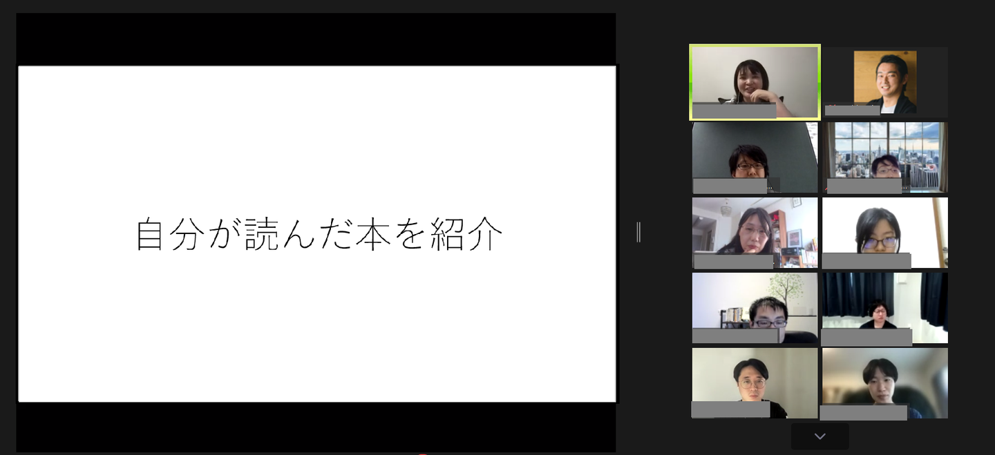 自分が紹介したい本の感想を述べたり、それに対して質問をしたりとざっくばらんに会話を楽しみました。UGにはビジネス書だけではなく、幅広い分野で読書を楽しむメンバーが多くいます。このセッションではインドの叙事詩や海外でも話題の小説など、幅広いテーマの本を紹介していました。