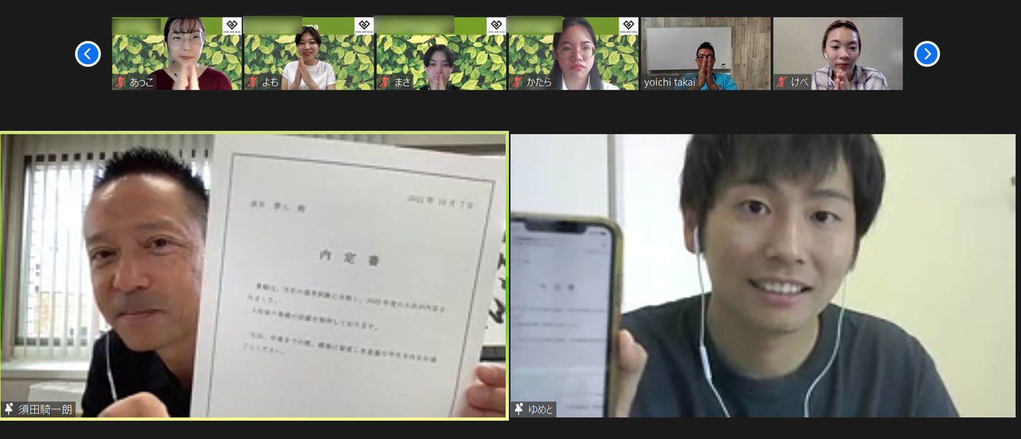 まずは内定証書授与からスタート!須田さん(社長)が一人ひとりの名前を呼びあげると同時に、私たちのスマホにPDF版の内定証書が届きました。オンラインでも、須田さんに名前を呼ばれるのはとても緊張しました・・・内定証書をいただいた時は嬉しい反面、身の引き締まる思いでした。