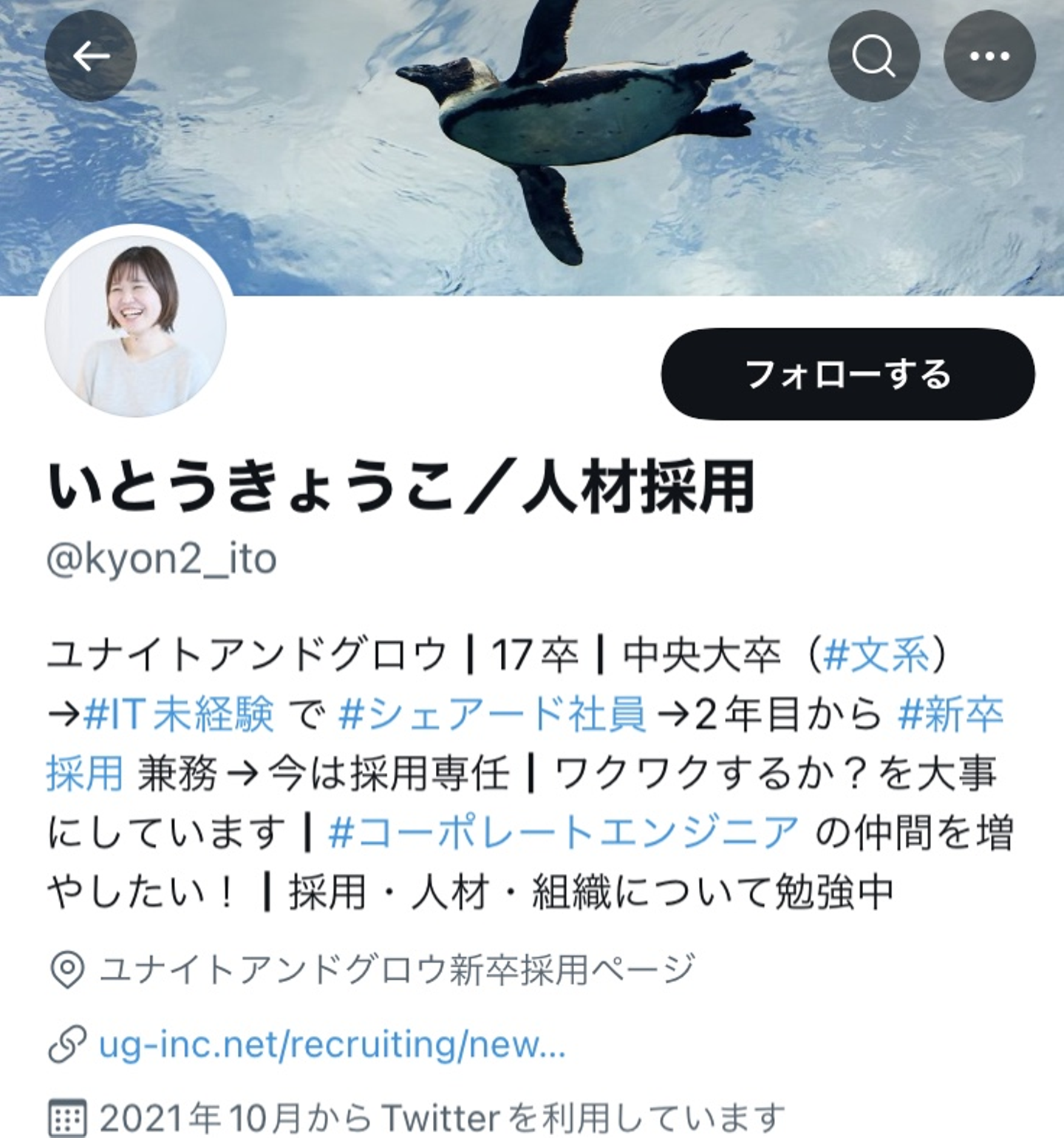 また最近はUG以外の採用に関する情報を仕入れたり、採用界隈の人脈を広げたりしたいと思い、UGの採用担当としてのTwitterアカウント※3を開設しました。