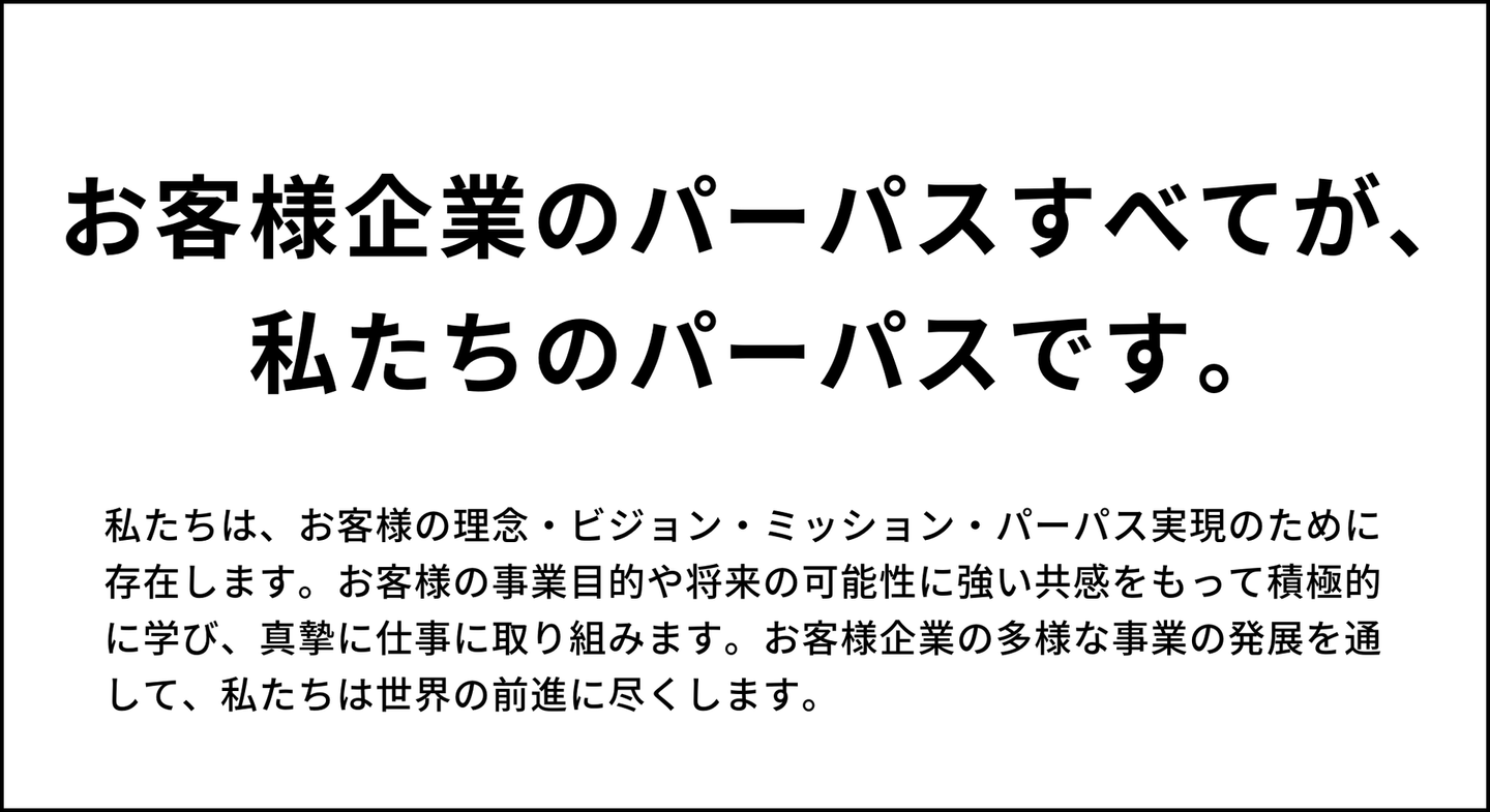 Purpose, Values & Vision 私たちは、お客様の理念・ビジョン・ミッション・パーパス実現のために存在します。 お客様の事業目的や将来の可能性に強い共感をもって積極的に学び、真摯に仕事に取り組みます。 お客様企業の多様な事業の発展を通して、私たちは世界の前進に尽くします。 ...