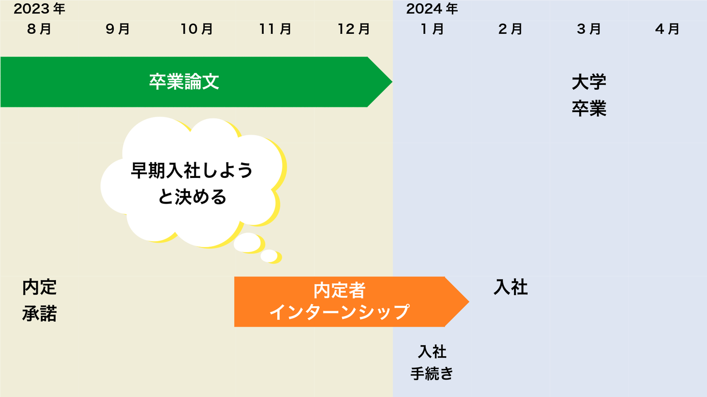 そうですね、基本的な動機は一緒です。あと、2024年4月入社が約30名いると聞いていたので、一斉に入社したら覚えてもらえないなって思ったんです。「みんなで一斉に」「よーいドン!」に合わせるのが苦手なんですよね(笑)だから、先にスタートできるならしちゃおうって思いました。