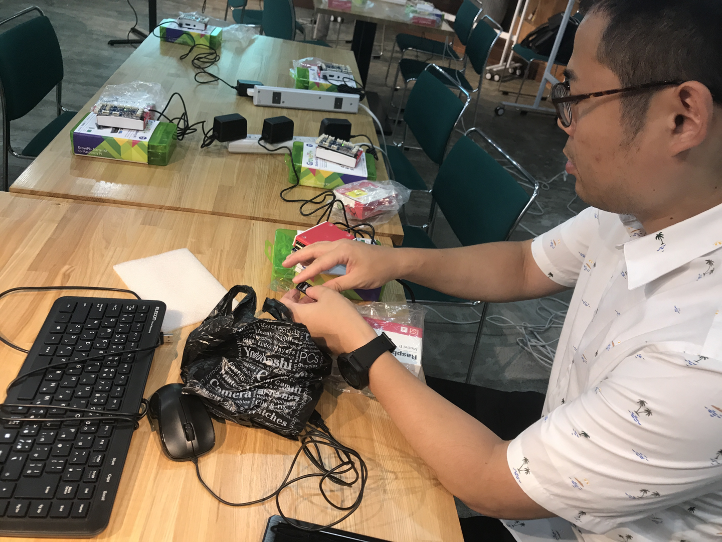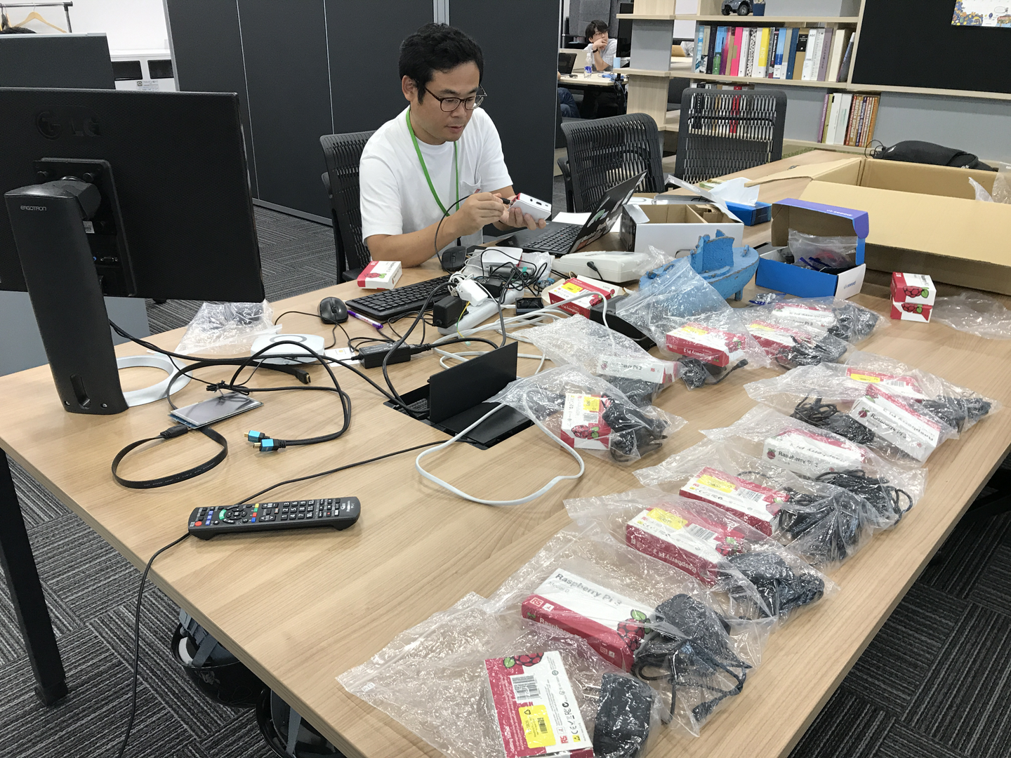 Raspberry Piや各種センサーを参加者人数に合わせてパックにしていきます。