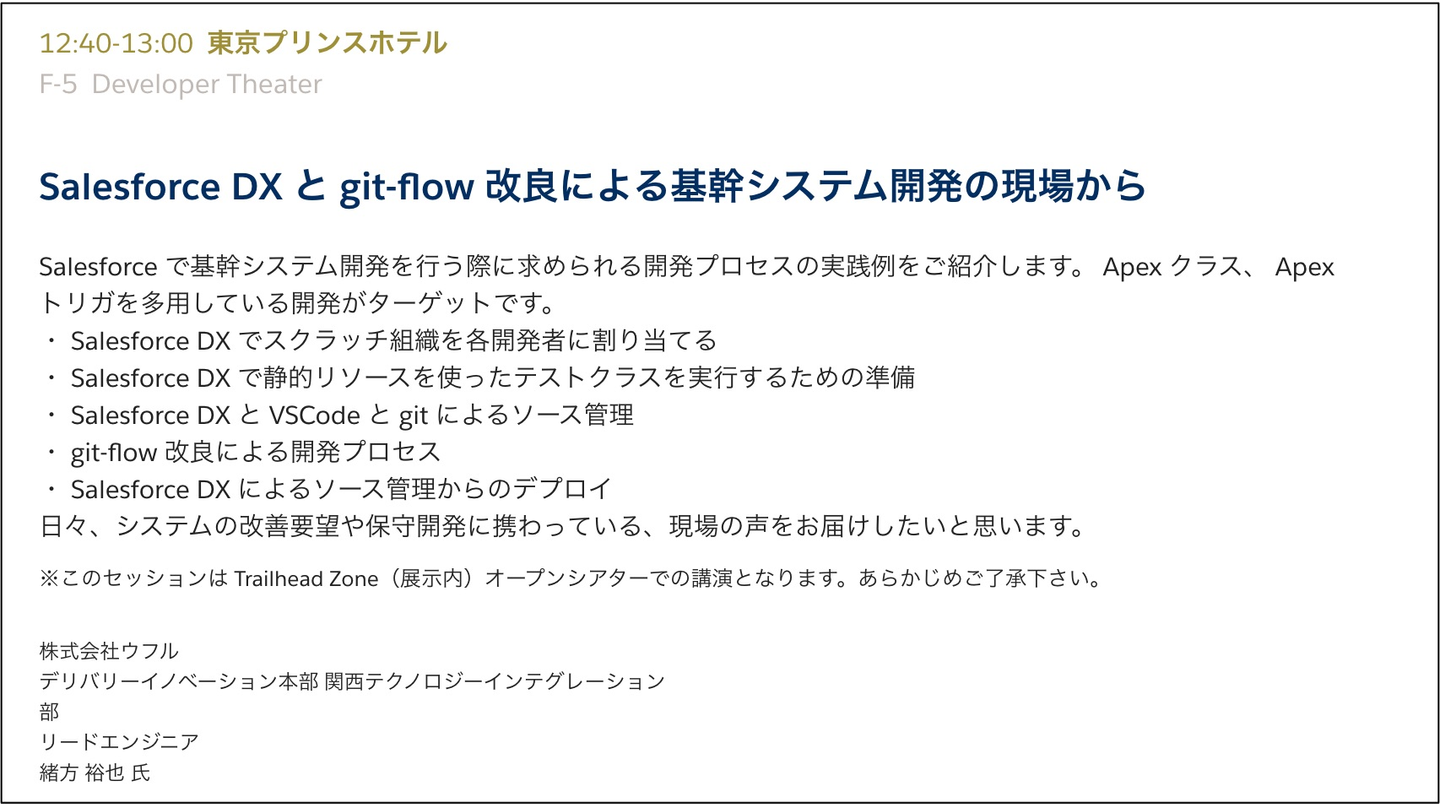 緒方:「Salesforce DX と git-flow 改良による基幹システム開発の現場から」というテーマで発表をさせていただきました。