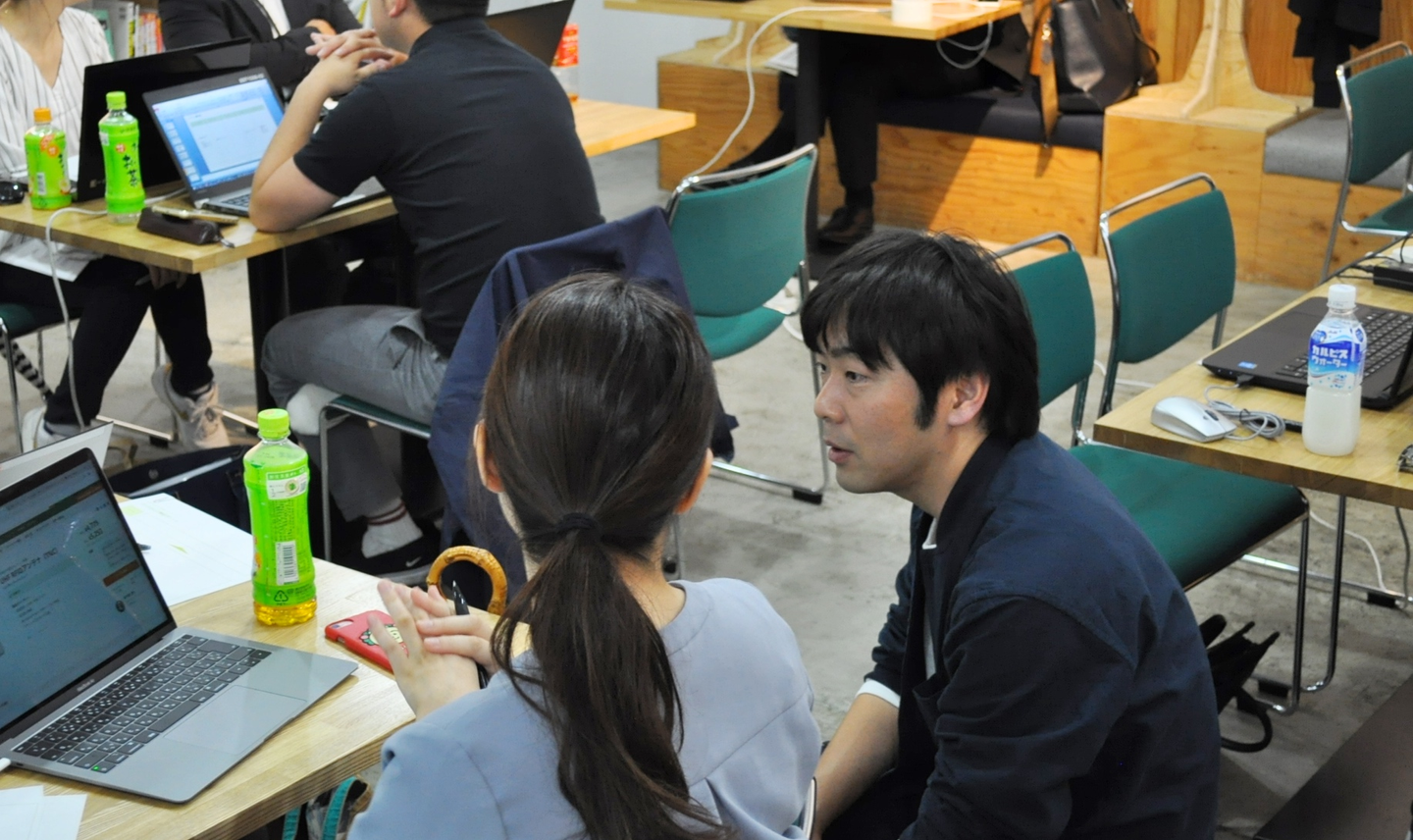 ワークショップを通して具体的な計画に落とし込みを行うため、 メンターによるプロトタイピングに必要な検証ポイントやデータに関する解説の後、実際にワークシートを埋めていきます。 メンターメンバーに積極的に質問する参加者様も。