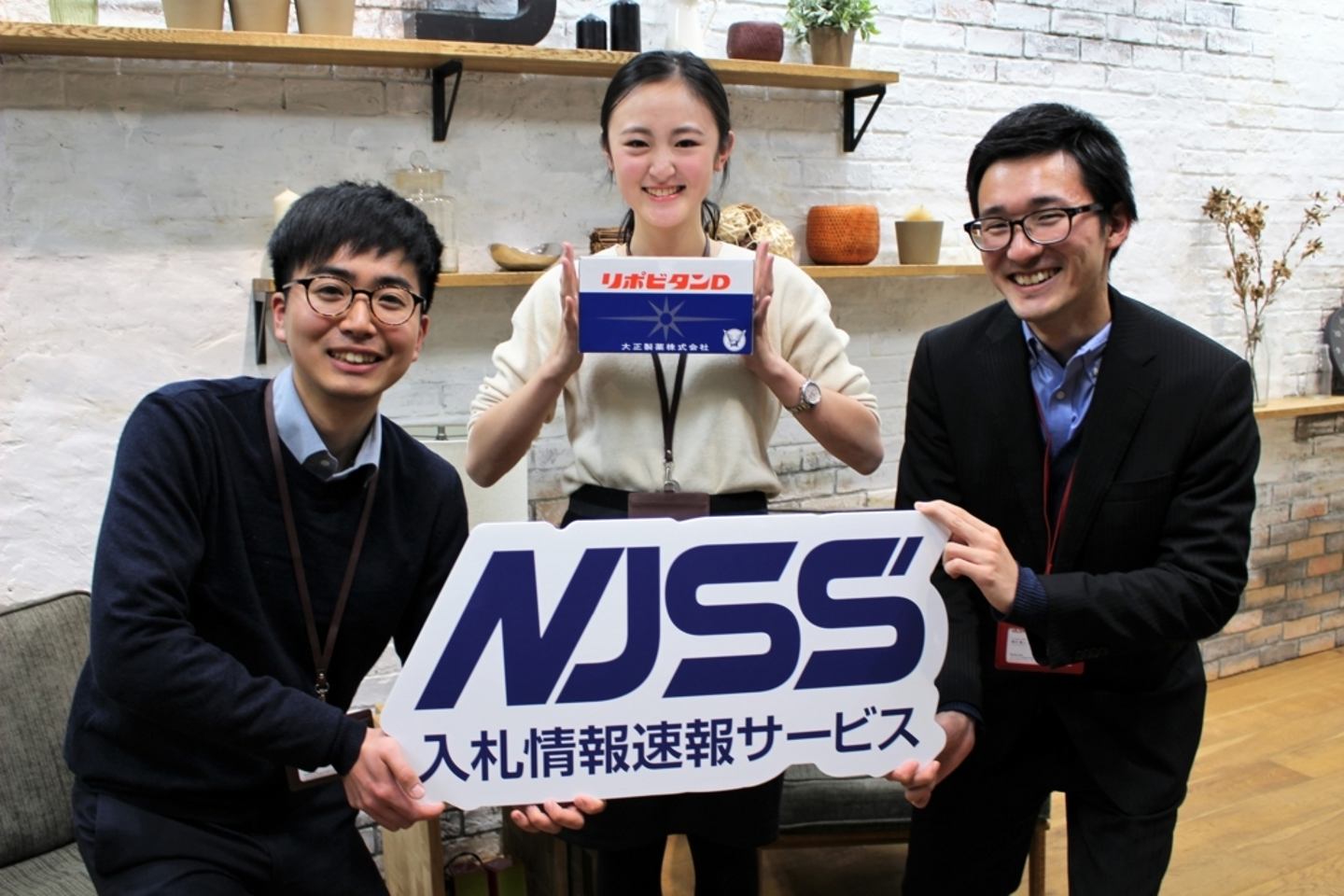 NJSS事業部の柴山から「入札情報速報サービスNJSS」のサービス内容についてレクチャーを受ける二人。充実し過ぎていて後光が射してる感じになってます。
