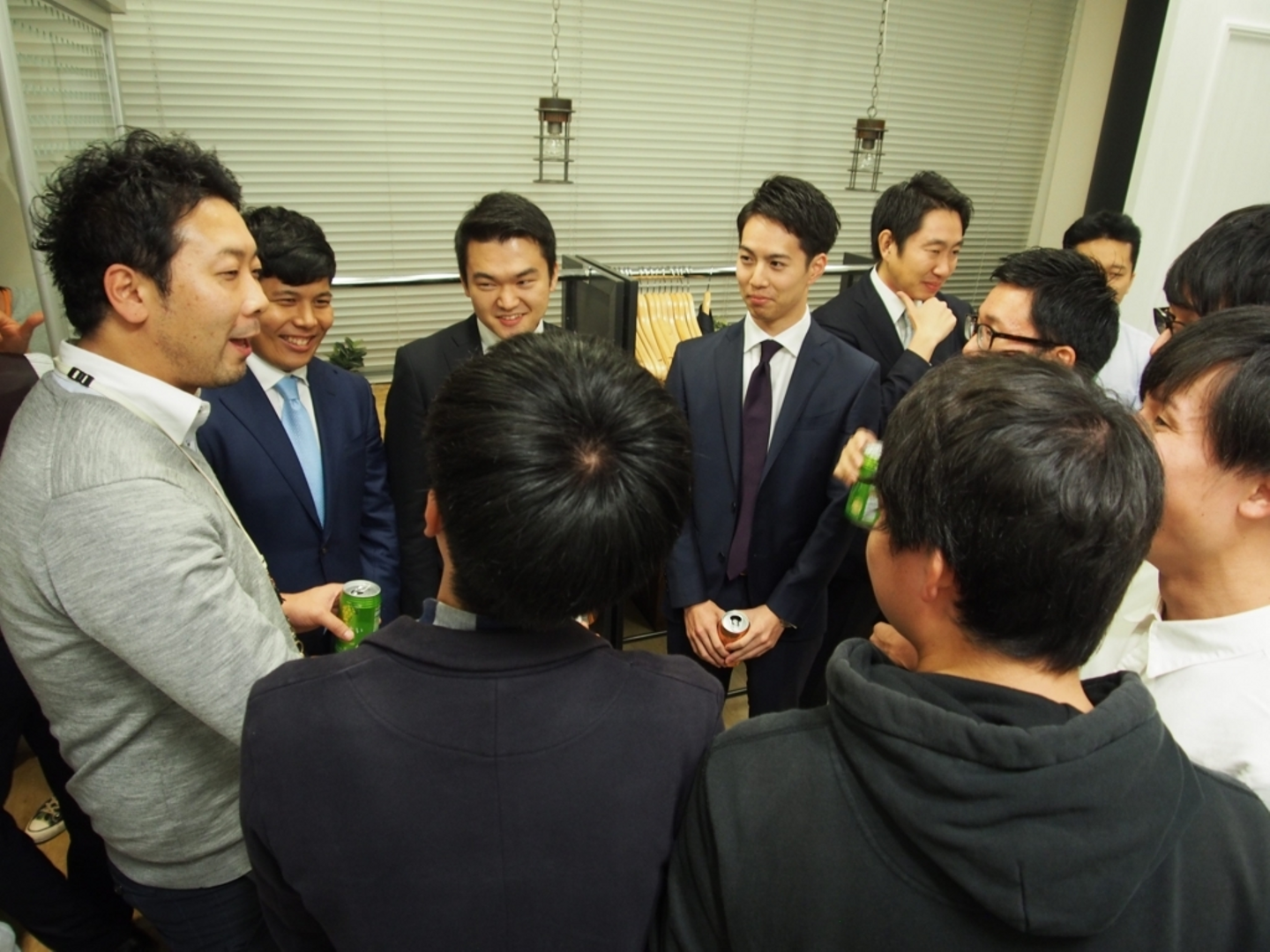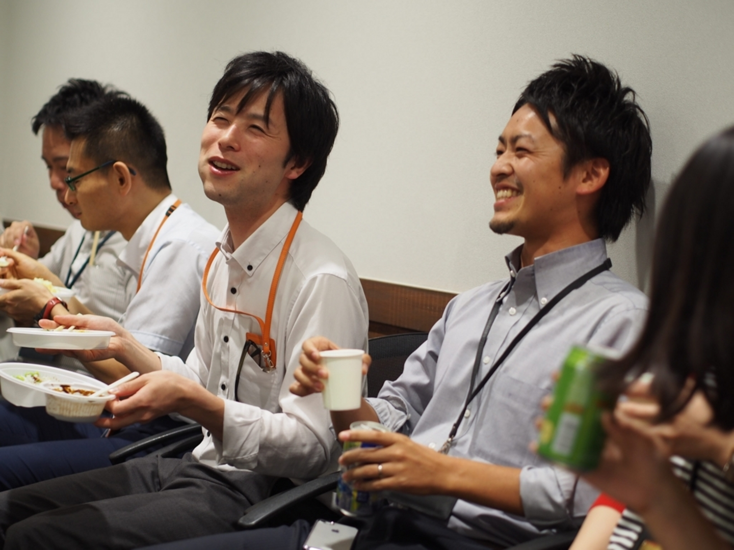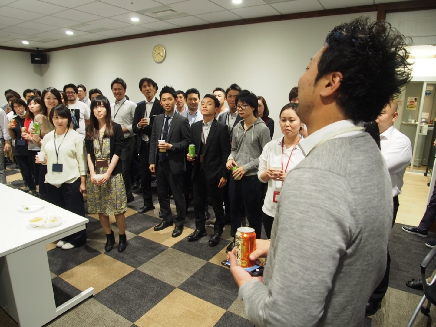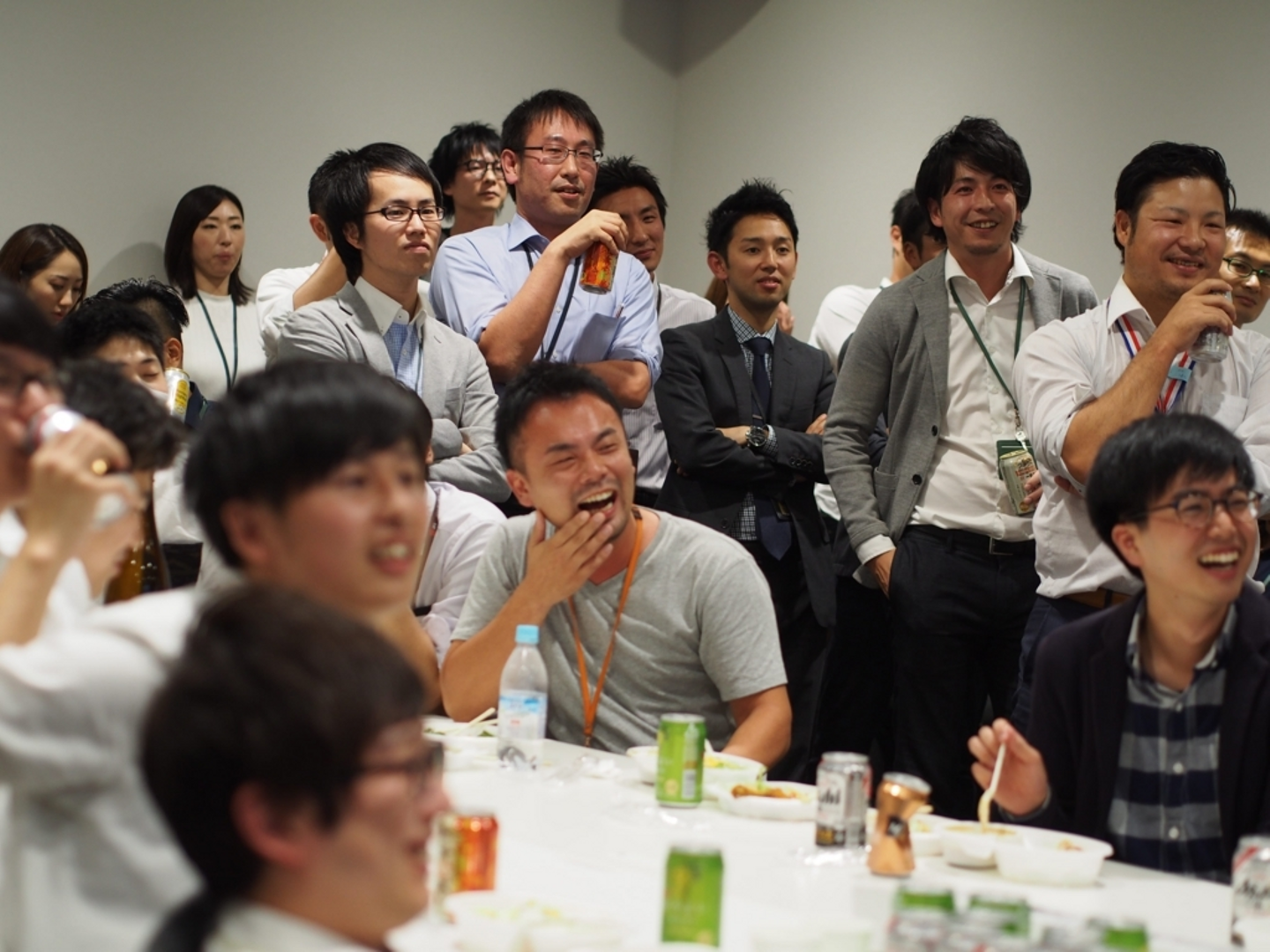 中間決起会は期末の決起会と異なり、通常営業日の就業後(19:00~)から実施。時間になると仕事を終えたメンバーたちがぞろぞろとセミナールームに集合します。