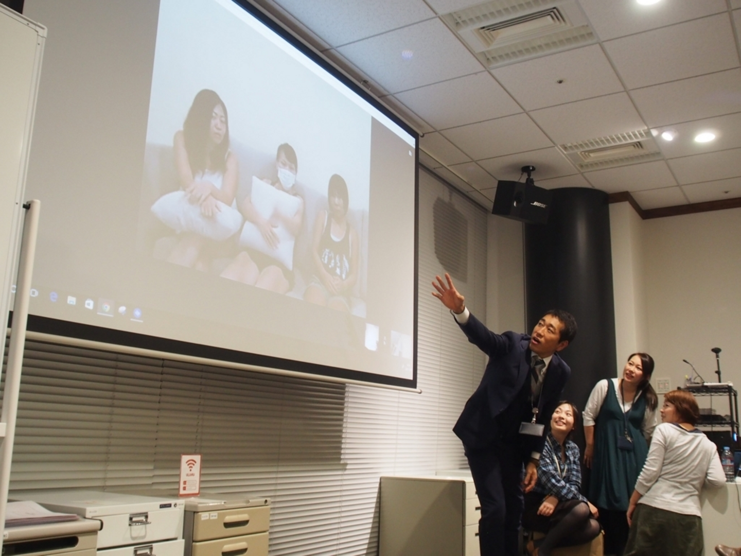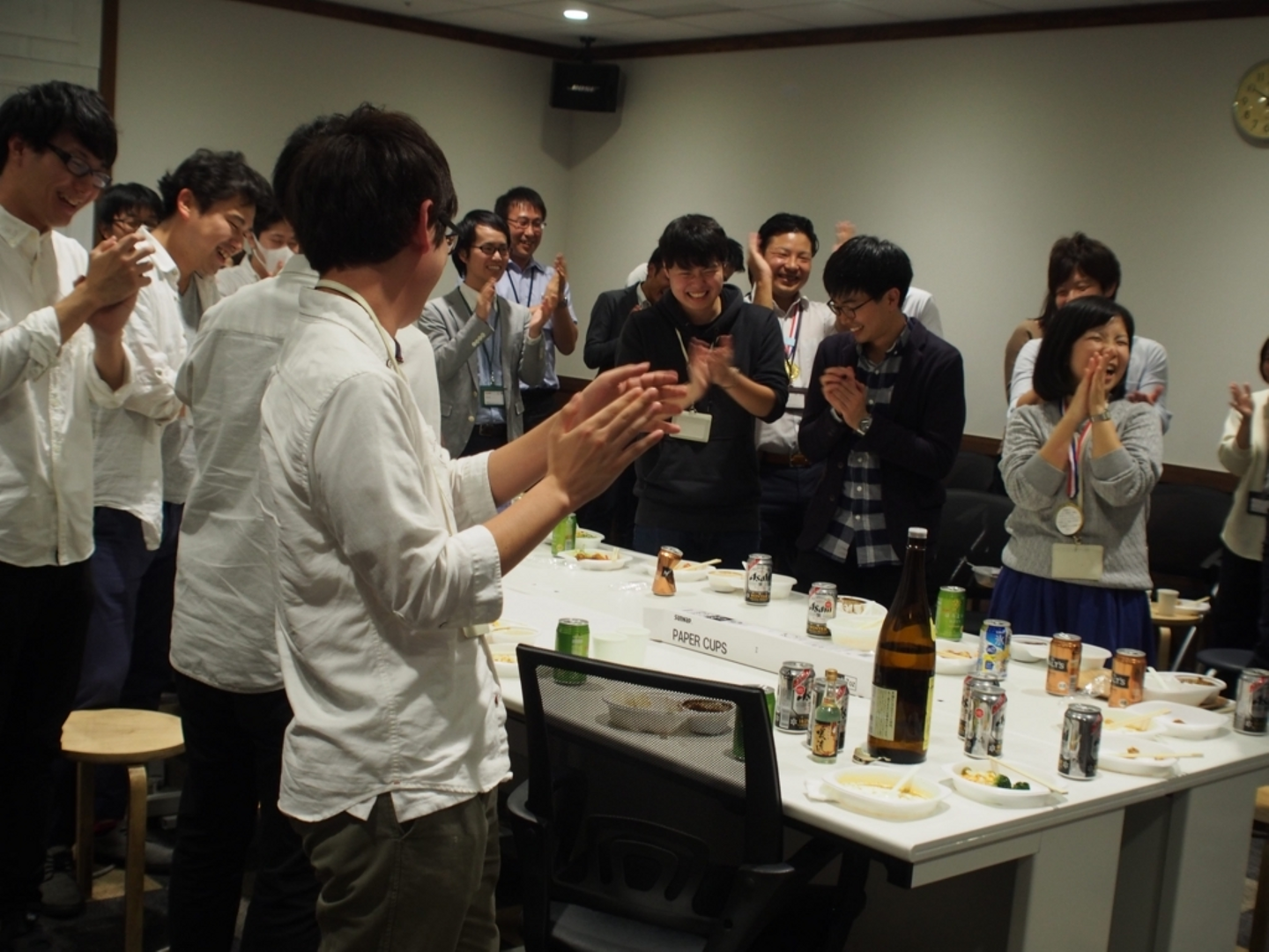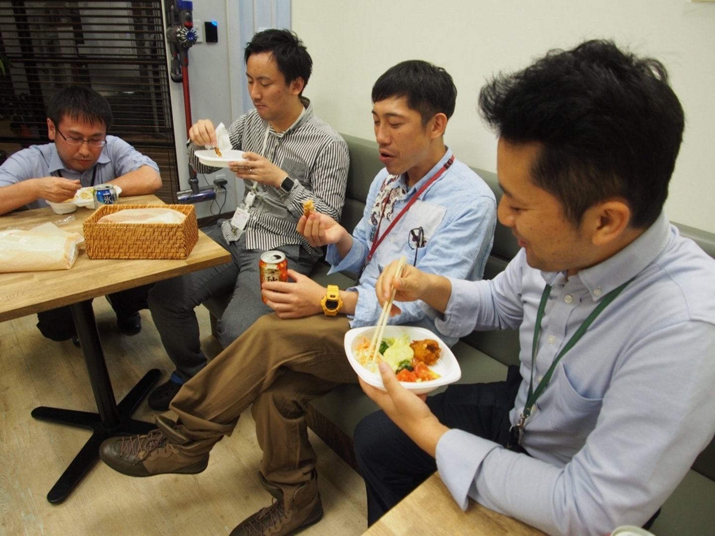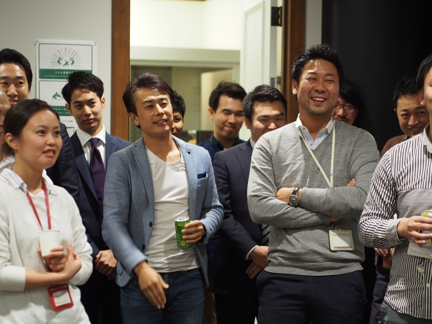 中間決起会は期末の決起会と異なり、通常営業日の就業後(19:00~)から実施。時間になると仕事を終えたメンバーたちがぞろぞろとセミナールームに集合します。