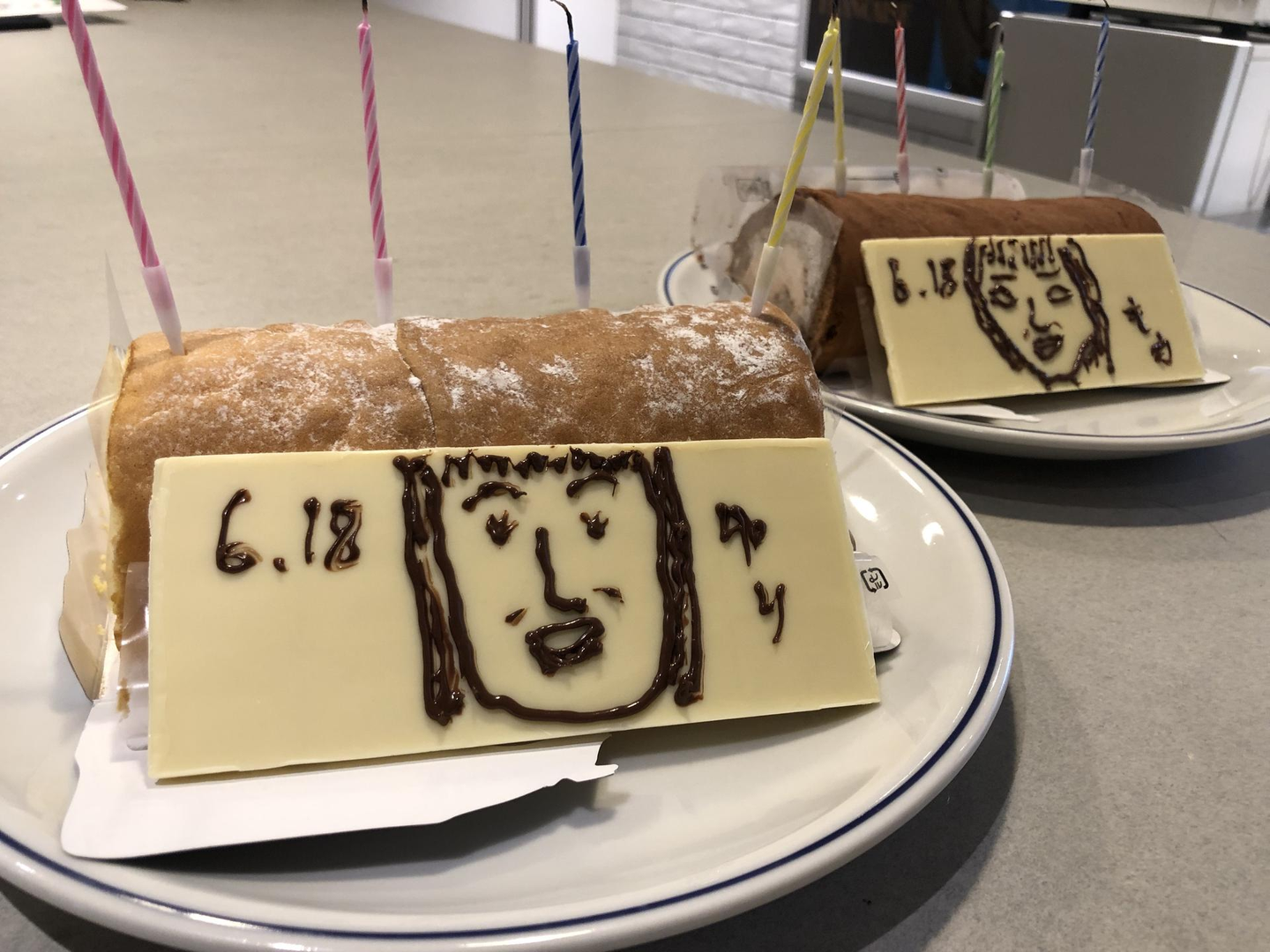 - スタッフの誕生日に、ケーキ&プレートに描いた似顔絵をプレゼント(茂吉さんから)