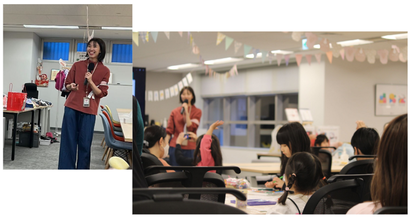 司会は、元幼稚園教諭の田中が担当!たくさんのこどもたちで賑わうオフィスでしたが、田中によるこどもたちの心を一瞬で惹きつける話し方や手遊びのおかげで、会場は一気に集中モードに。
