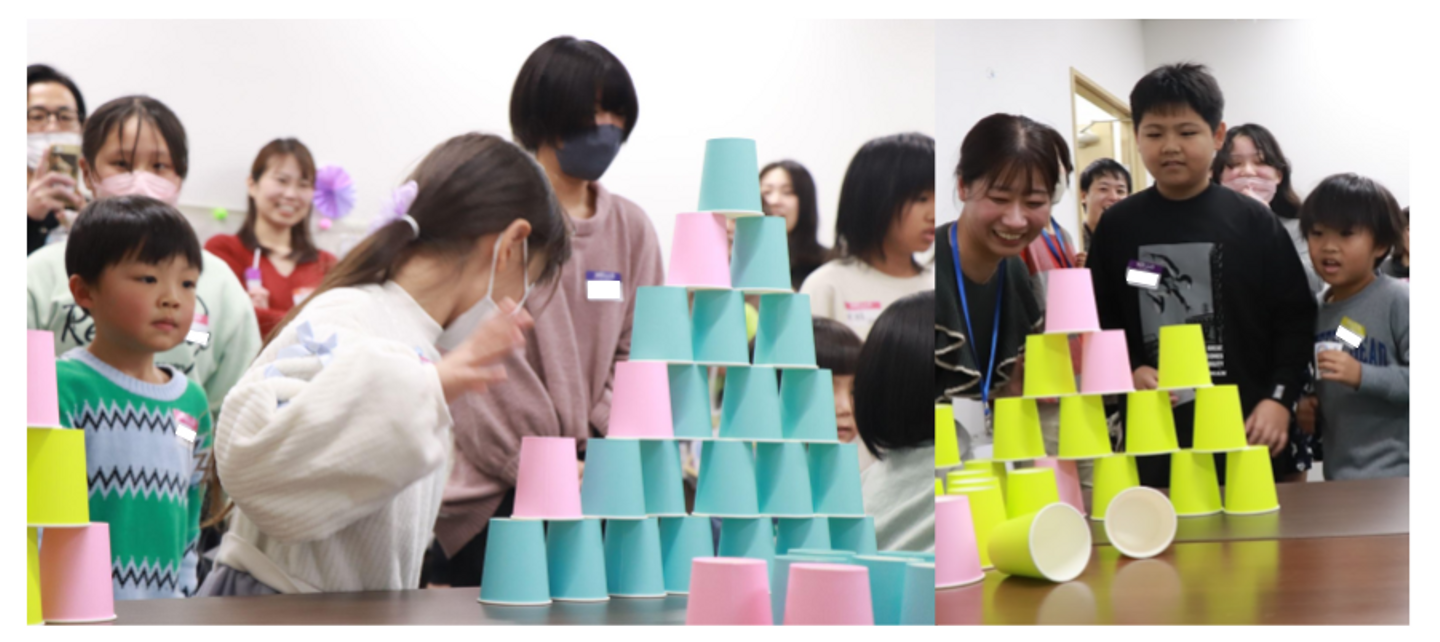 紙コップをカラーで分けて、綺麗に協力しながら積み上げていく北九州チーム