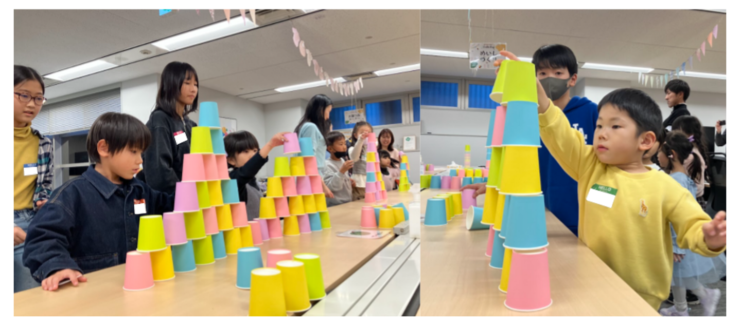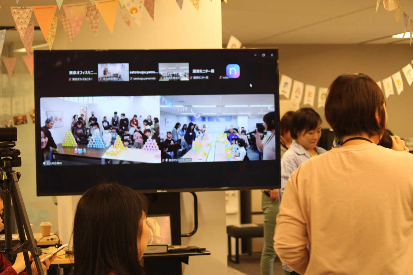 オフィス対抗戦でモニター越しに両オフィスの様子を映し出しながら、こどもたちがチーム一丸となってコップを慎重に、かつ大胆に積み上げていきました。アンケートでも、このコップつみつみ大会は大好評!