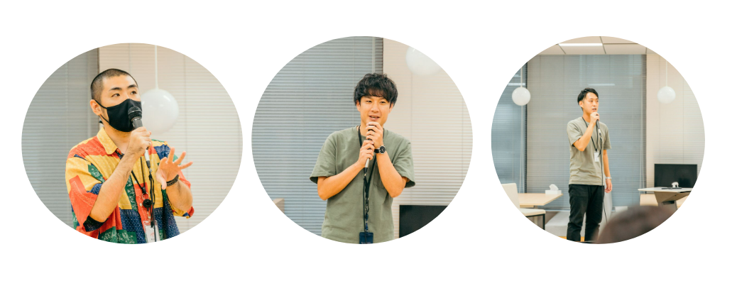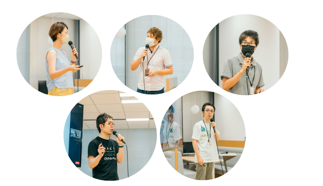 ※写真はオンサイトでスピーチした人達のみ掲載しています。写真左上から時計回りに、営業部 部長山本、事業推進部 部長代理 船越、事業開発部 部長代理 嘉数、取締役CTO赤沼、プロダクトマネジメント部 部長山口