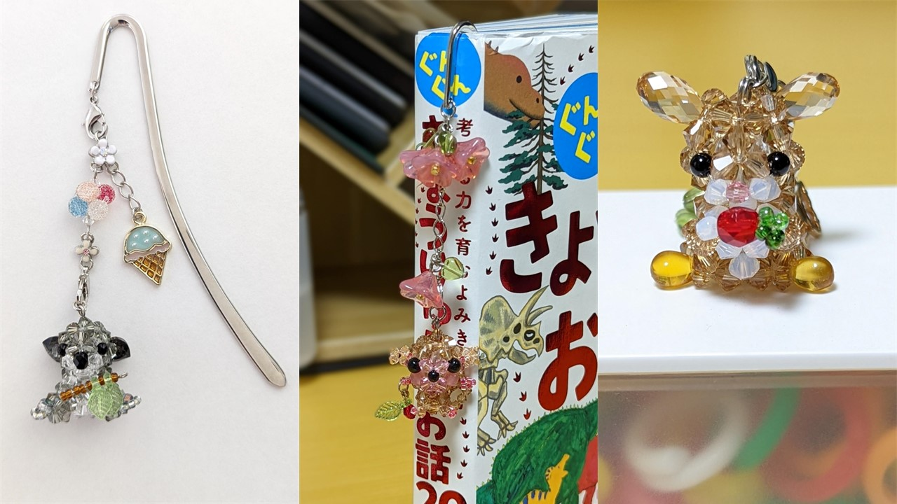 大橋が制作したビーズ作品。写真中央は、ビーズ作り再開のきっかけとなった、自身の娘がお気に入りの本に使用し始めた栞。