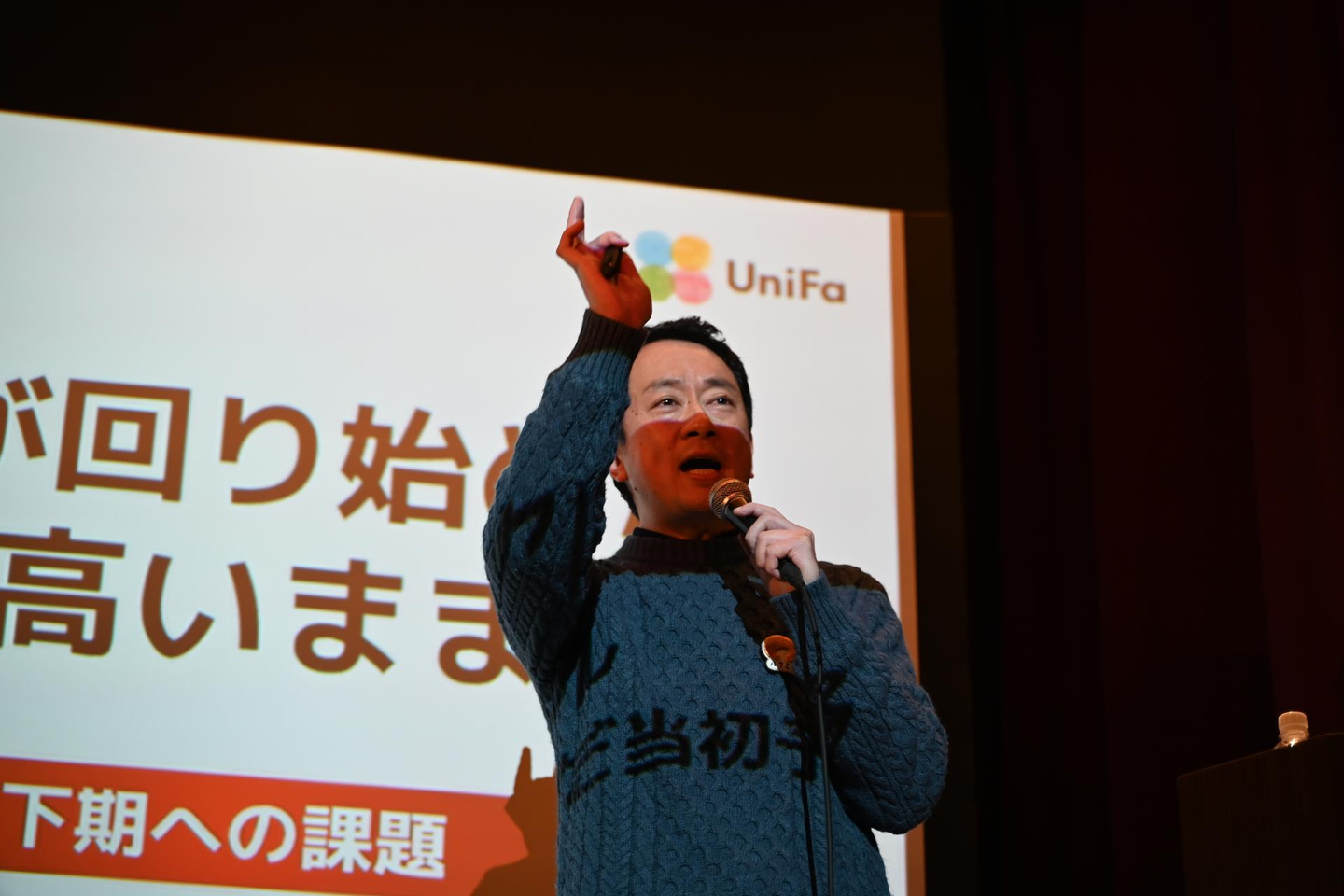 前回に引き続き、リアルの会場参加とオンラインのハイブリッドでの開催となりました。上期の業績の振り返りや各部における下期戦略・戦術の共有、Special Contents、Unifa Award の3部構成でした。本レポートでは当日の模様をダイジェストで共有します。