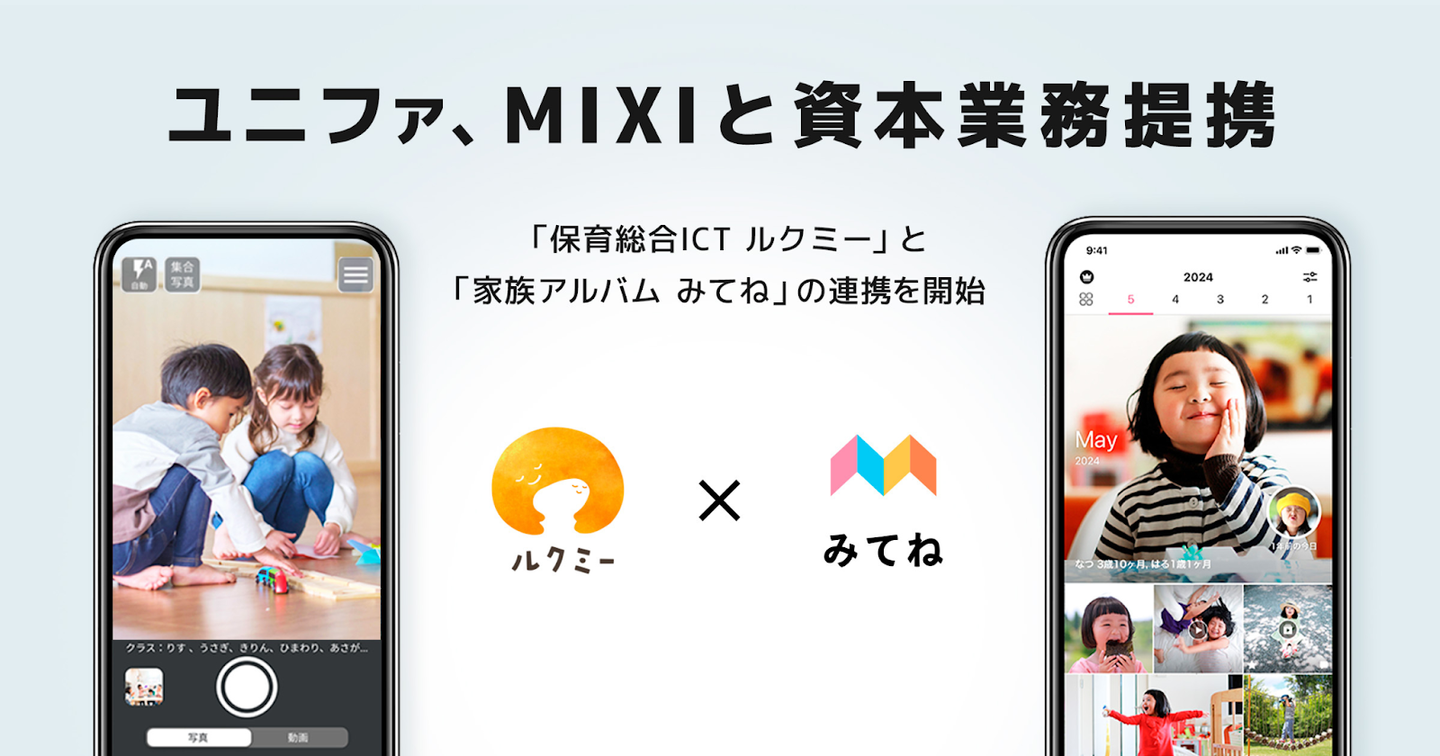 今回の資金調達に合わせて、ユニファは株式会社MIXI(以下「MIXI」)と資本業務提携契約を締結しました。「家族の幸せ」、「こども」、「コミュニケーション」をキーワードに、ユニファの「保育総合ICT ルクミー(以下「ルクミー」)」シリーズとMIXIの「家族アルバム みてね(以下、「みてね」)」のサービスを連携することで、更なる事業成長を目指していきます!(プレスリリース②)