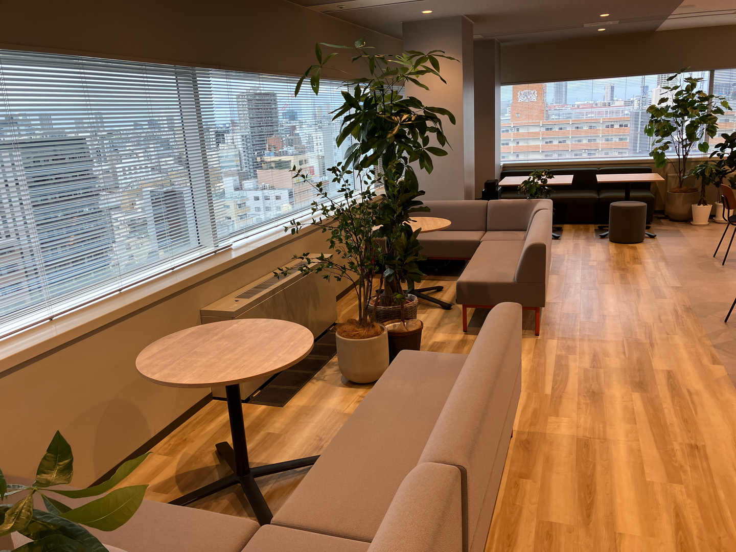 窓の外にスカイツリーと両国国技館を望む、開放感あふれるスカイラウンジです。開放的な景色を眺めながら、コーヒーを片手に一息ついたり、ランチタイムに部署の垣根を越えて雑談を楽しんだり。リラックスした雰囲気だからこそ生まれる、新しいアイデアやインスピレーションの源泉となっています。
