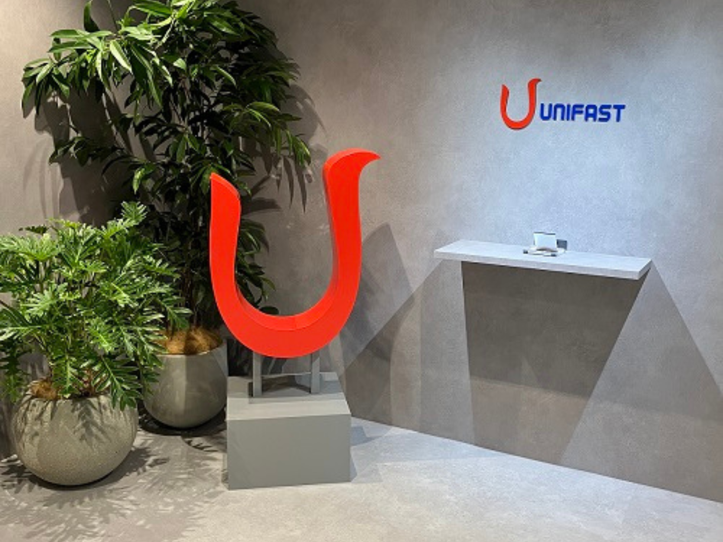グレーを基調としたモダンで落ち着きのあるエントランスです。壁には私たちのブランドロゴが静かに輝き、その手前には企業のシンボルである「U」の立体的なオブジェが印象的に佇みます。