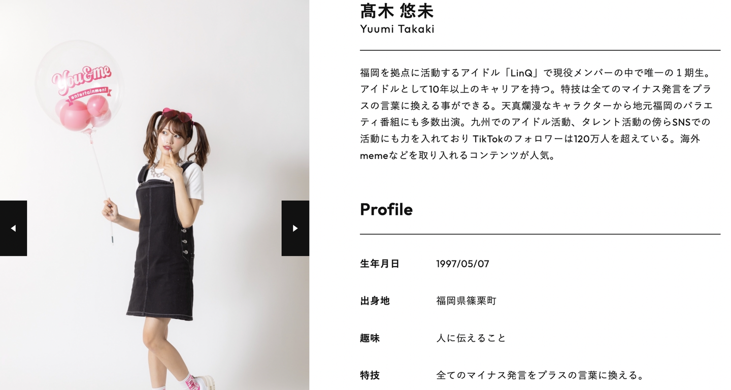 第四弾は、福岡を拠点に活動するアイドル「LinQ」のメンバーでありアイドルとして10年以上のキャリアを持つ「髙木 悠未」です!