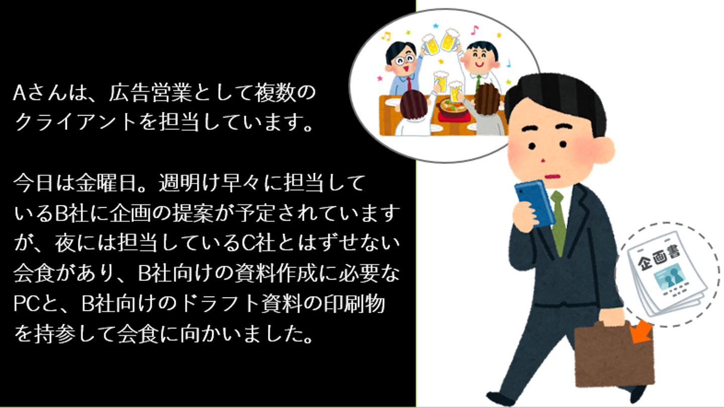 紙芝居のようなスライドを全員で見て、ストーリー内の主人公が「何を事前にするべきだったか」「すぐに何をしたらよいか」という視点で周囲の人とディスカッションするのです。