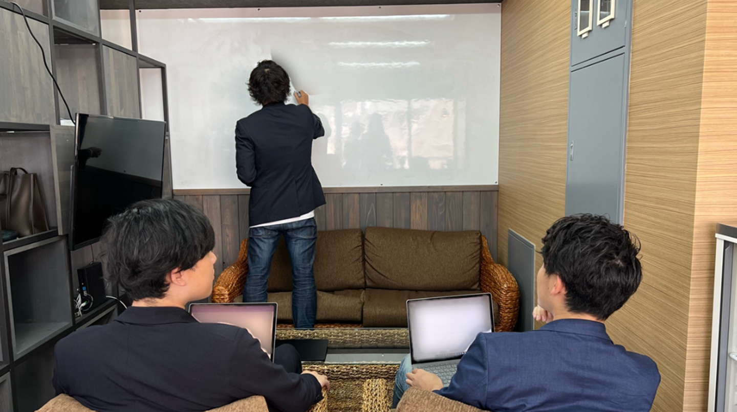 壁の一部がホワイトボードになっているので、会議内で挙がった意見はここでまとめることが出来ます。また、モニターも設置しているので、資料共有の際に大画面での閲覧が可能となっています。