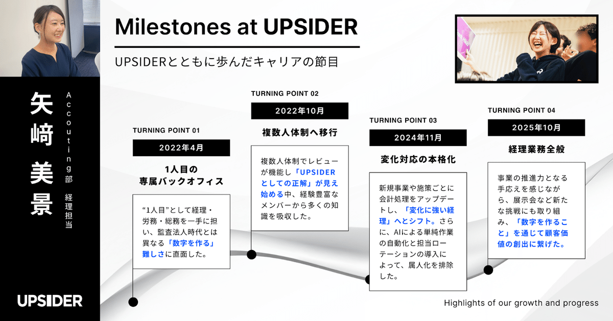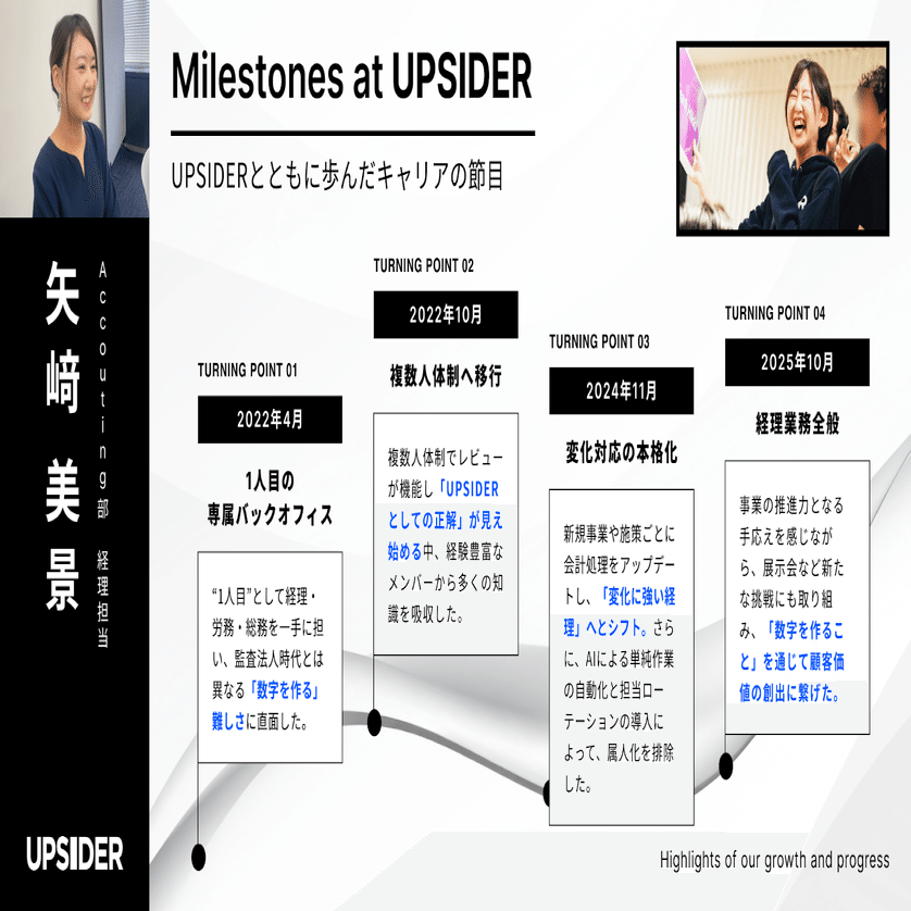 新卒で入社した監査法人では、会計のプロフェッショナルとして財務諸表など正しく数字が記載されているのか、「数字を見る」キャリアを歩んできたMikageさん。しかし、実務経験のない自分が「先生」と呼ばれることに違和感を覚えるようになったことから、「数字を作る」側になるべくUPSIDERへの転職を決意します。