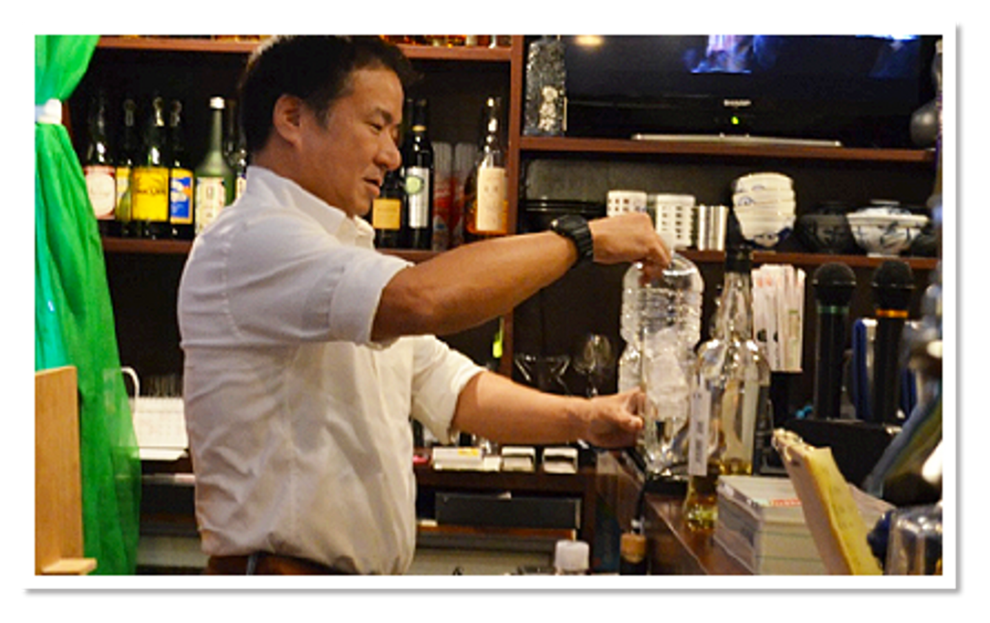 ▲社員の言いたい放題にも、笑いを噛み殺して水割りを作り続ける上原社長