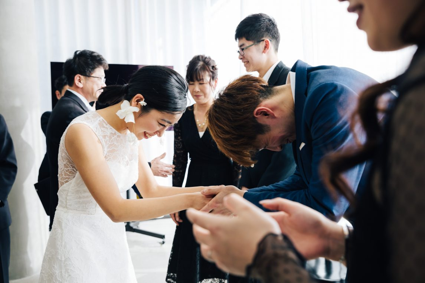 その日の御新郎様はご家族がとても仲が良くて、実家に帰った時は「じゃあまたね」と言ってご両親とハグをする習慣があったそうなんです。そのハグがとても思い出に残っていたとご新郎様から伺っていたので、思わず私から「せっかくだからこれから家族になる皆さんともハグで始めてみませんか?」と伝えてみたんです。