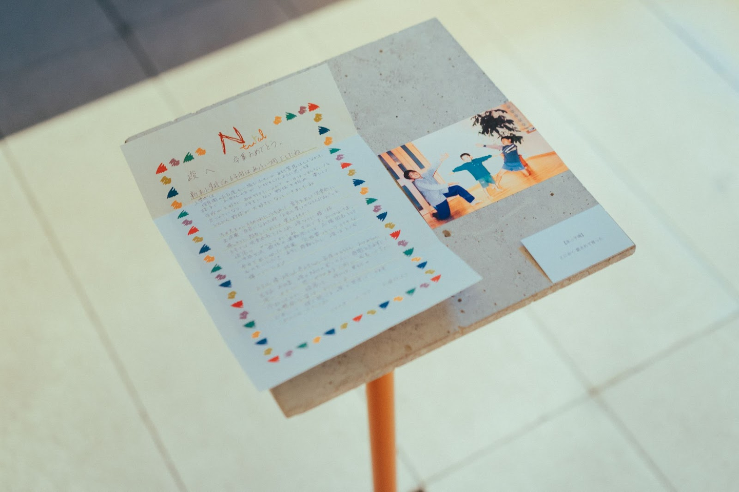 案内に従ってギャラリー(受付スペース)に移動すると、そこにはふたりの思い出の品とゲスト全員へ宛てた手紙がありました。