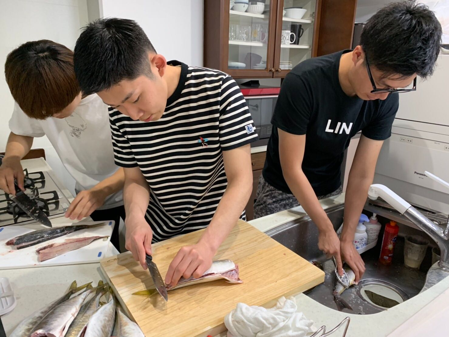 料理が得意な土谷さん(写真右)に魚の捌き方を指導して頂き、人生で初めてアジの三枚下ろしに挑戦しました!