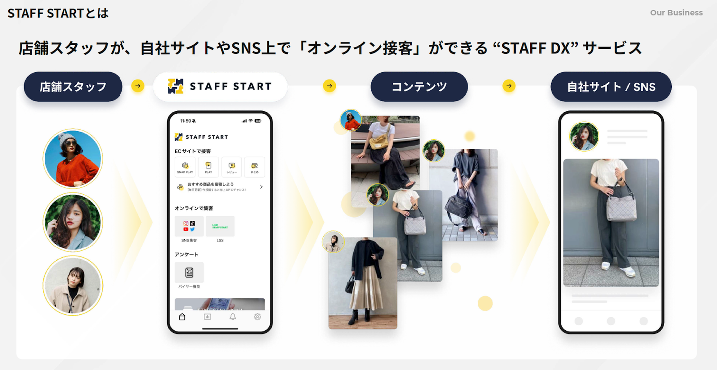 「好きを、諦めなくていい世の中を。」をビジョンに掲げ、店舗スタッフの接客力をそのままECでも活かせる『STAFF START』というSaaSサービスを提供しています。