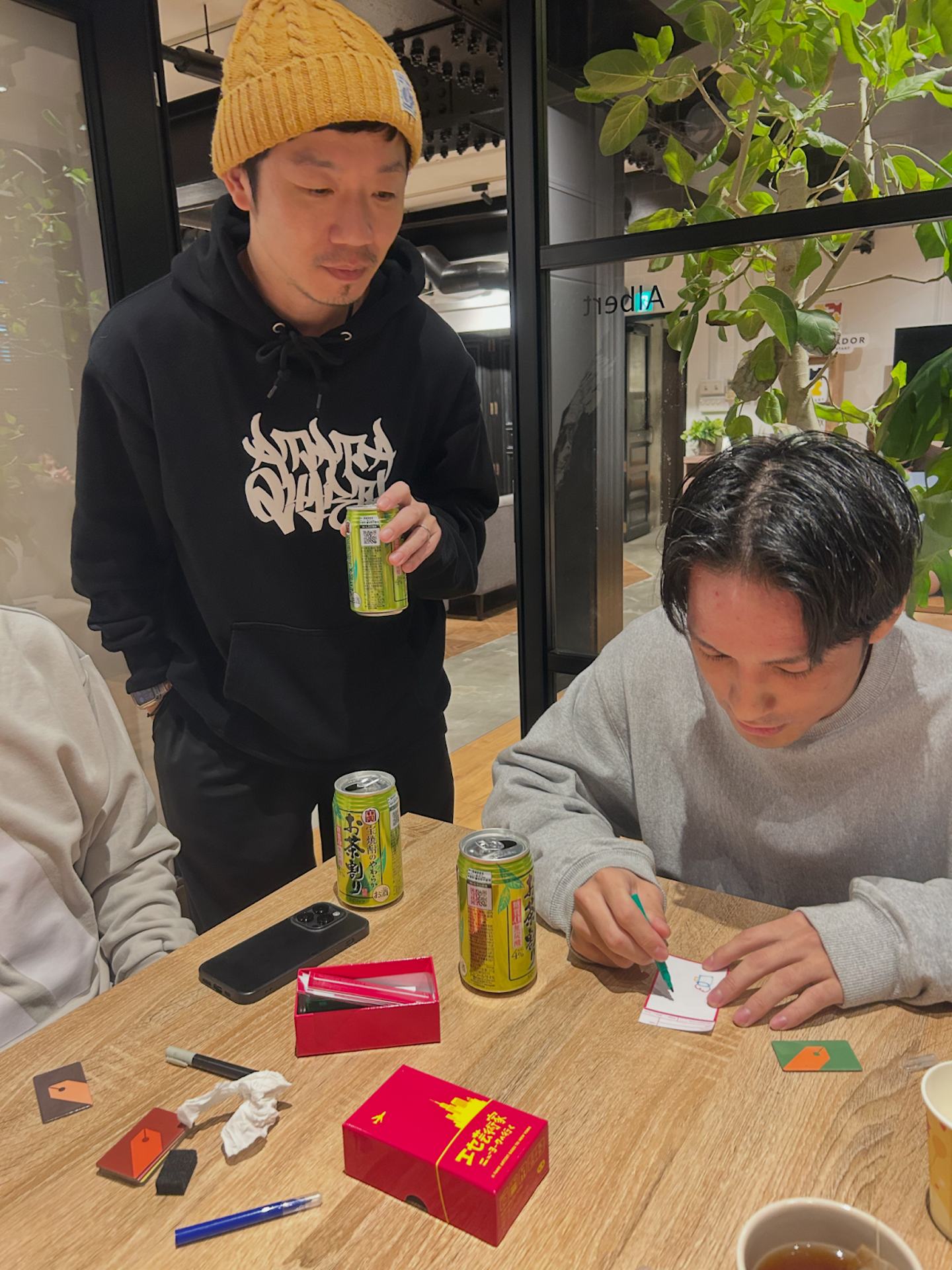 今回実施したのは「エセ芸術家、ニューヨークへ行く」というカードゲーム。配られたお題カードに書かれたテーマに沿ったひとつの絵をみんなで協力して完成させるのですが、参加者の中にはお題カードに何も書かれていない人(=あてずっぽうで絵を描く”エセ芸術家”)が混ざっています。絵が完成したあと、誰がエセ芸術家なのかを当てるという絵心と心理の読み合いが試されるゲームです。