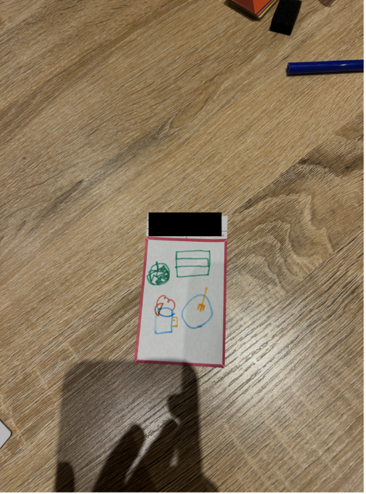 緑色の丸い物体はサッカーボール、謎の四角形はドイツの国旗。下段に描いてあったのはジョッキに入ったビールとお皿、フォークでした。