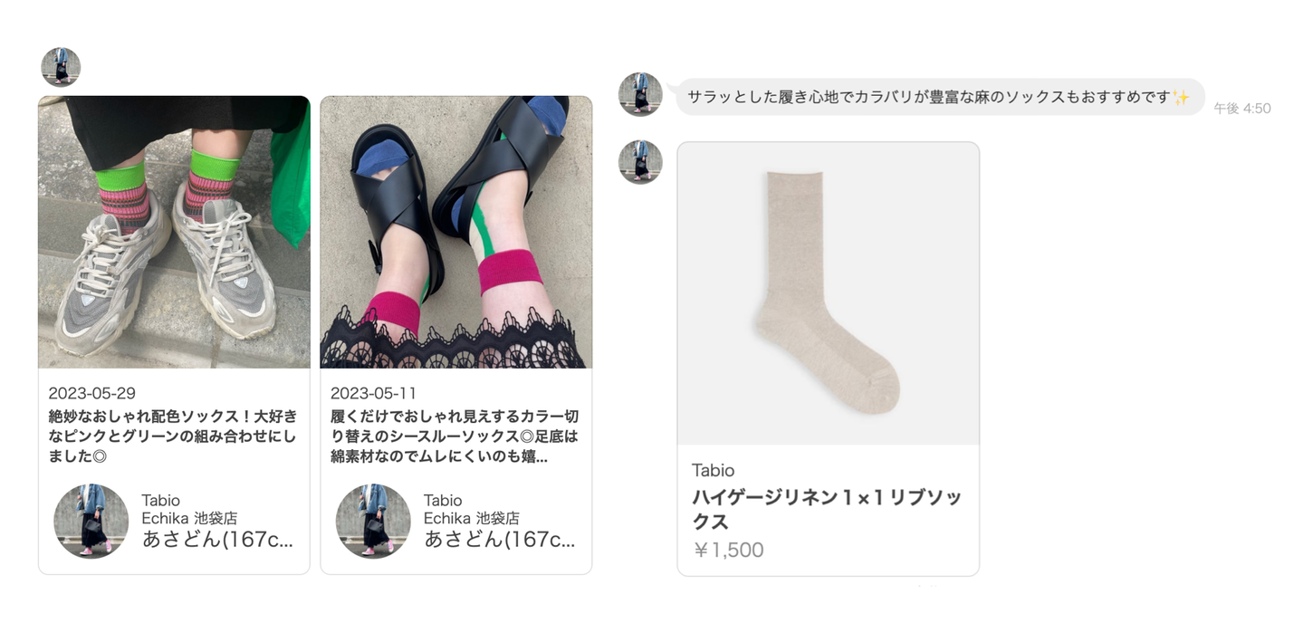 今回の接客を通じて複数の商品を購入することができました!今回購入した商品は普段身につけないような柄や色味で、もし自分一人で店舗で悩んでいたら「いつもと違うから飽きちゃうかも」と購入を控えていたかもしれません。しかし、あさどんさんから「シンプルなスタイルほど、靴下で印象を変えられるから楽しい」とアドバイスをいただき、納得したうえで購入することができました。