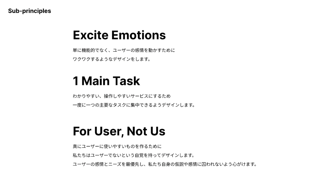 これからデザインチームをつくっていくことを意識して、感覚的になっていた部分をルール化するような「デザインガイドライン」をつくったり、デザインチームとして大事にしたい「Design Principle」をつくったり。今までの目先のためのデザインではなく「今後」デザインをしやすくするための準備に時間を費やしています。