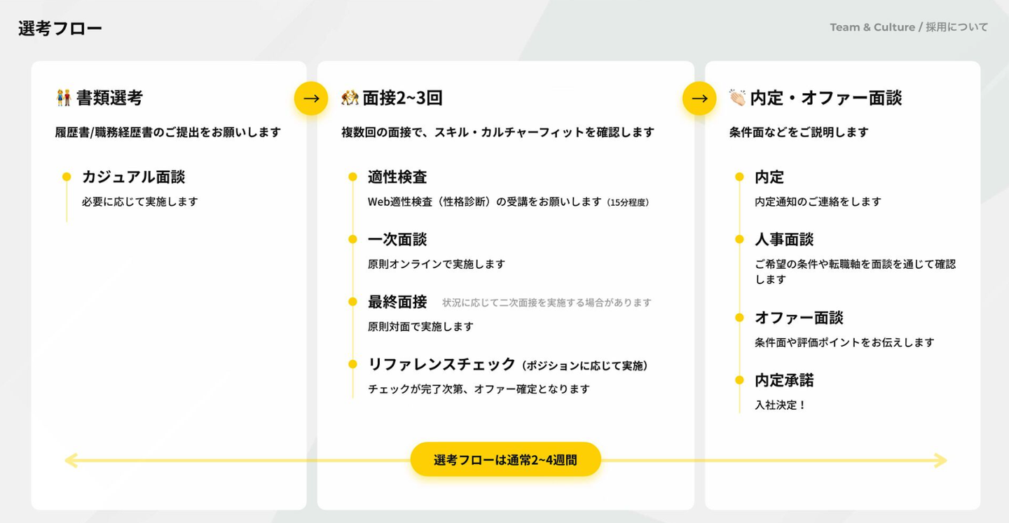 確かに、他社様の選考と比較して少しお時間をいただいてしまっているところも正直あるかもしれません。それでも「お互いにとってハッピーな転職にしたい」という思いでコミュニケーションをとらせていただいているという背景もありますので、こうした選考フローをいい意味で活用いただきながら、候補者様視点でもしっかりと見極めをいただきたいと思います。
