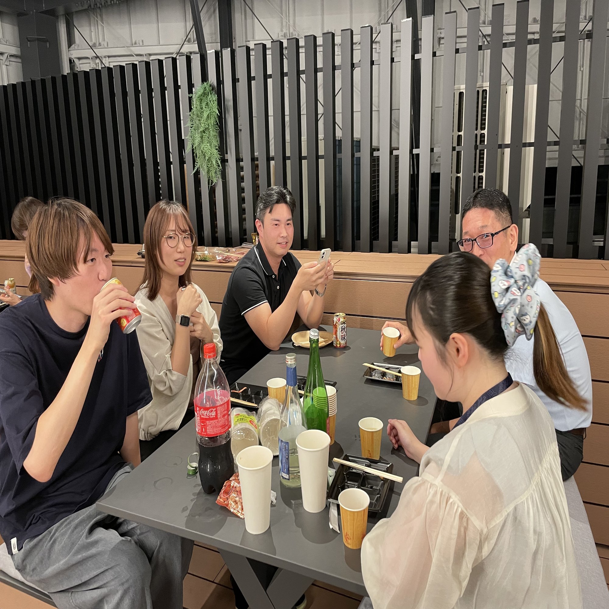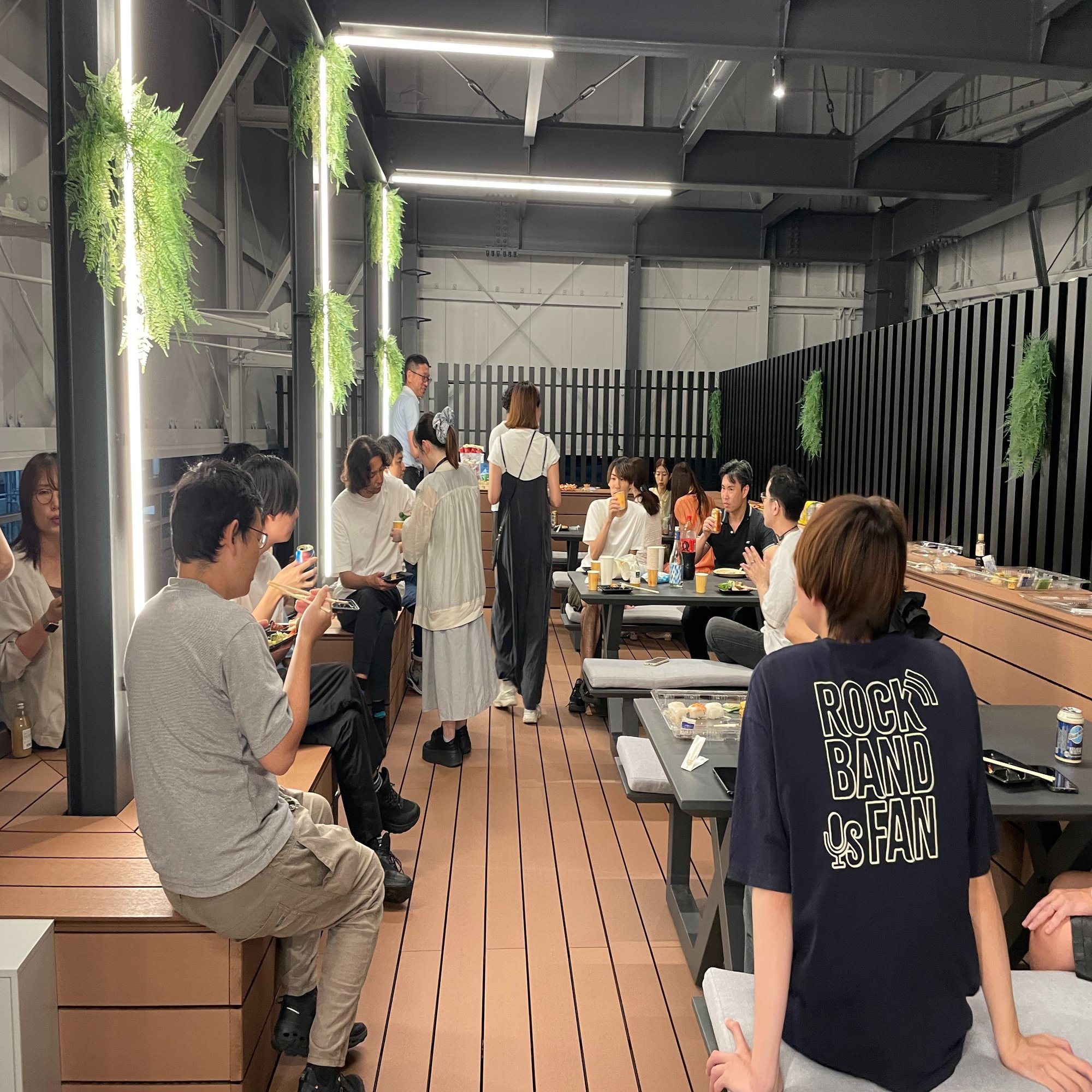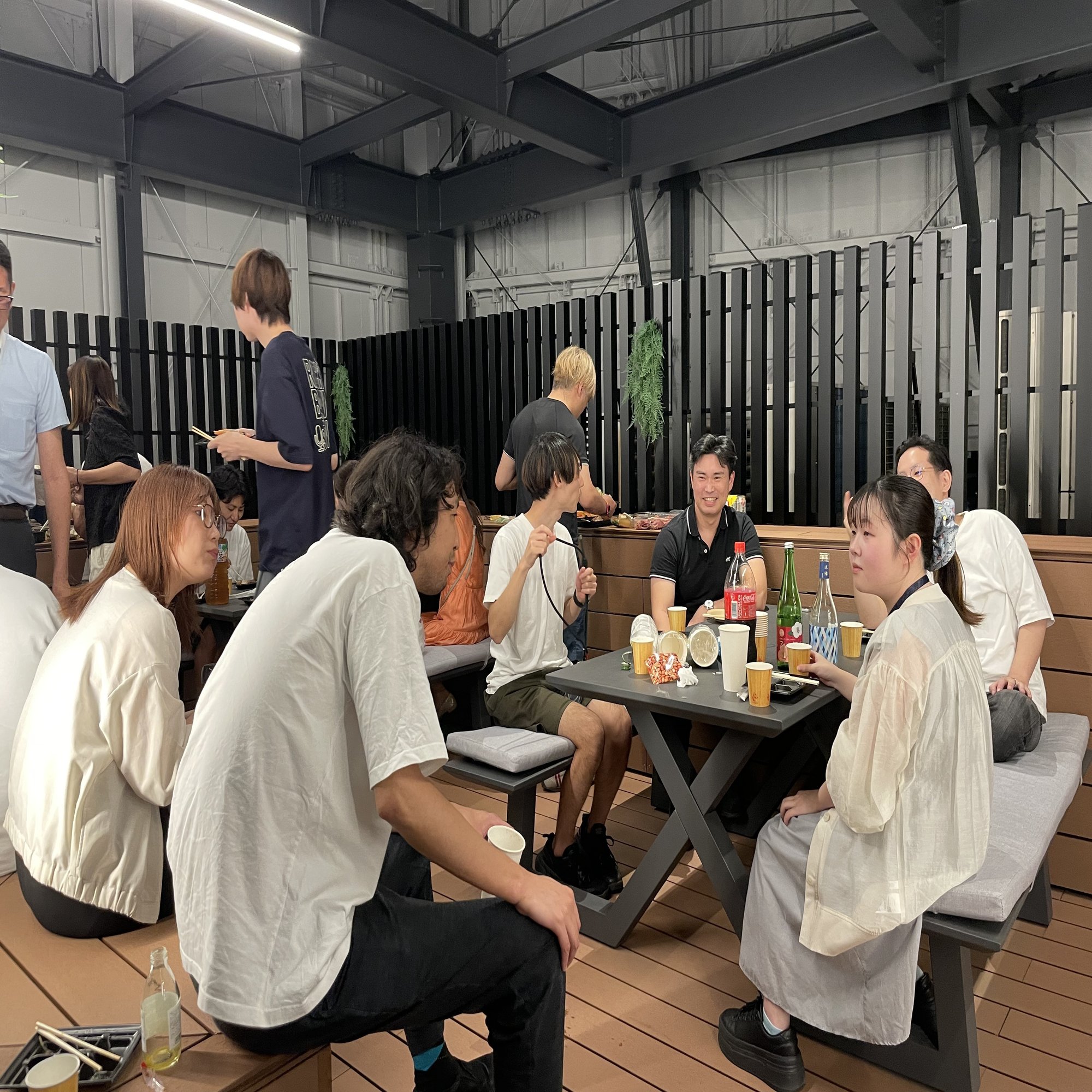 仕事を終えた社員たちが続々と新オフィスの屋上スペースに集まり、普段は会議などでなかなか顔を合わせない各部署のメンバーも、この日ばかりは同じ空間で肩を並べました。異なる部署で働くメンバー同士が新しいオフィスで顔を合わせることで、自然と会話が生まれ、部署の垣根を越えたコミュニケーションが広がっていく。そんな光景がとても印象的でした。
