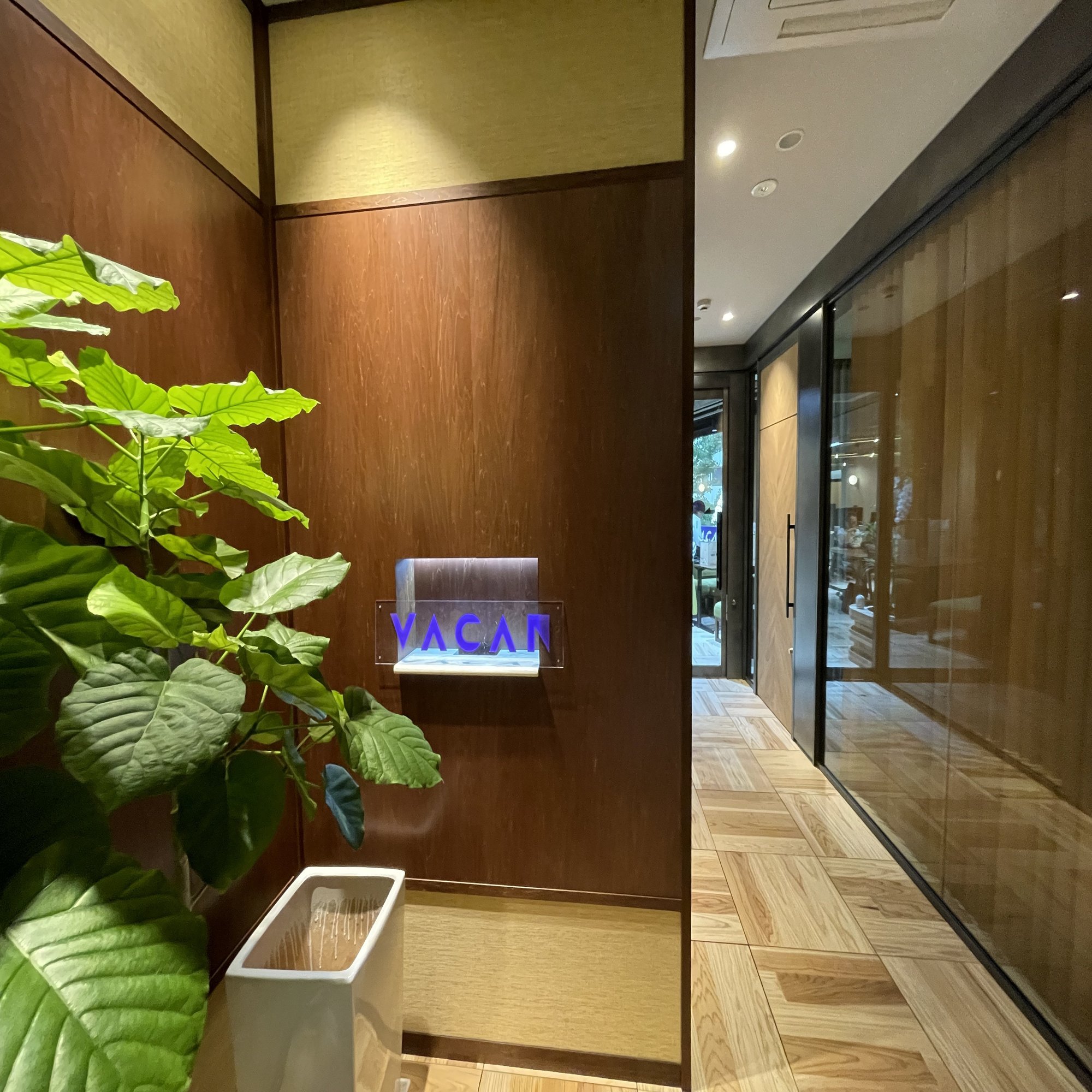 また、今回移転した新オフィスは、集中して作業できるスペースと気軽に相談できるオープンスペースをバランスよく配置し、自然な交流を後押しする設計です。照明は調光機能付きで、夕方に向かうにつれて雰囲気がやわらかく変化。床や照明、ブラインドには天然木を用い、おしゃれで洗練された空間を演出しています。リフレッシュコーナーにはバカンメンバーのお土産のお菓子や差し入れが並び、ちょっとした息抜きの時間を彩ってくれます。さらに、Webミーティング用のオンラインブースも複数用意されており、社員が働きやすい工夫を随所に施しています。