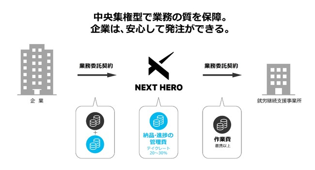 民間企業や自治体等から受注した仕事を就労継続支援事業所に最適に分配する、プラットフォームの役割を担う会社です。「就労困難者の大活躍時代をつくる」をビジョンに掲げ、就労困難者特化型DXプラットフォーム「NEXT HERO」を通じて、潜在的な労働人材(障がいのある方々等)がビジネスの市場で大活躍できる仕組みづくりに取り組んでいます。当サービスにより新たな仕事の流通が生まれ、障がいや難病のある方々のキャリア及び賃金の向上が期待できます。さらには、民間企業や自治体等と就労継続支援事業所・就労困難者に、仕事を通じた「新たな繋がり」を生みだしています。
