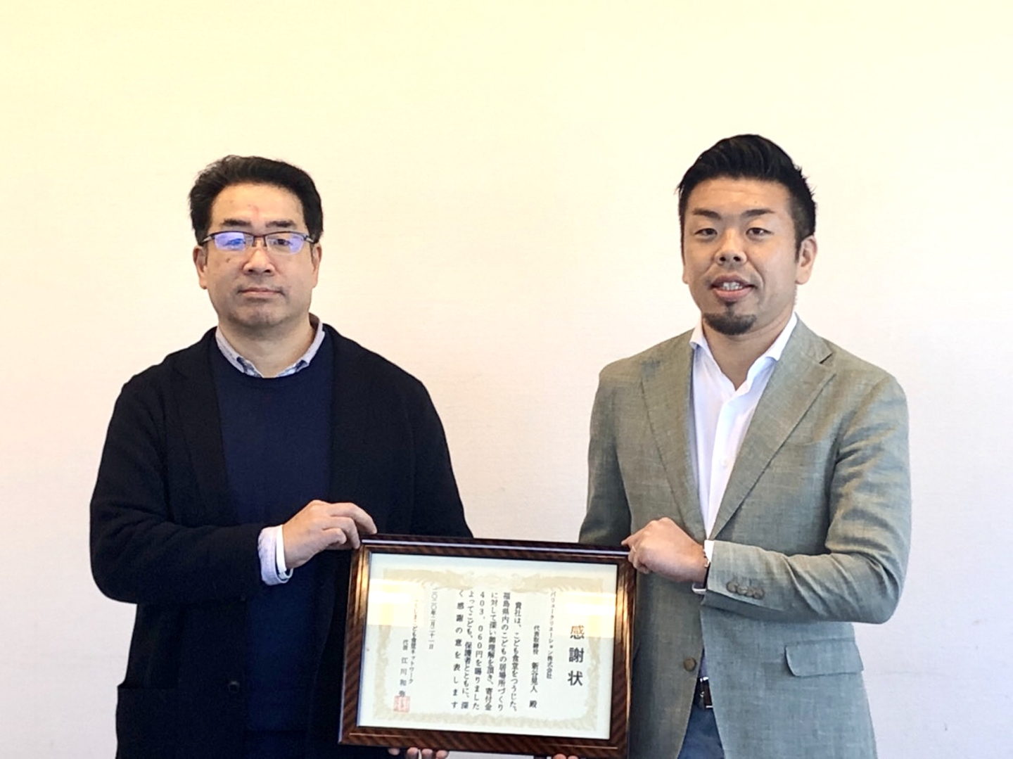 (右) バリュークリエーション株式会社 代表取締役 新谷晃人 (左)ふくしまっこ子ども食堂ネットワーク 代表 江川和哉様