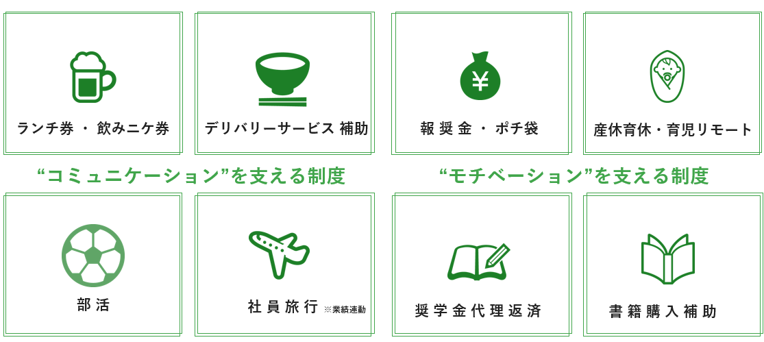 会社の補助で仲間と食事を楽しめる制度や部署間の交流をサポートする部活等があったり、長く働ける環境づくりに関する奨学金代理返済制度や産休育休をサポートする制度等があります。