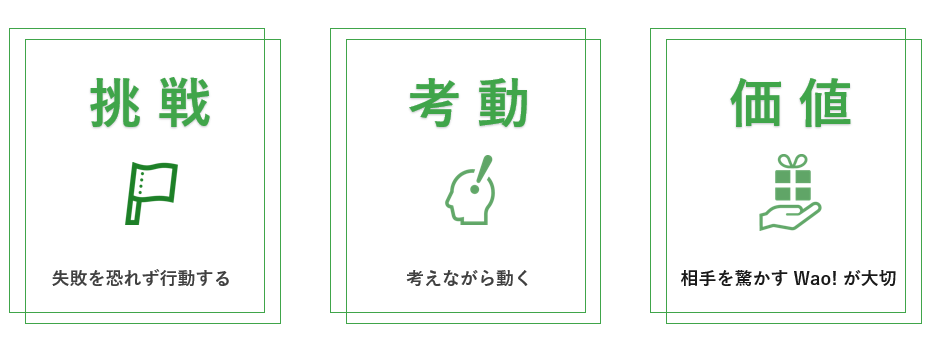 私たちが大切にしている行動指針に「挑戦」「考動」「価値」というものがあります。