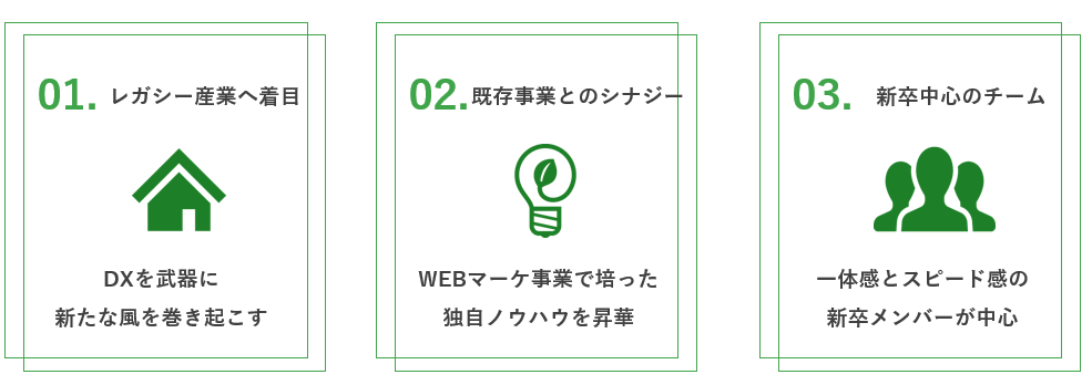 マーケティングDX事業の特徴は図の通り3つあるのですが、その中でも特徴的なのが“独自ノウハウ”です。”解体の窓口”というサービスを運営する中で蓄積した、リアルなノウハウを元にしたマーケティングは他社にはない、最大の特徴だと言えます。