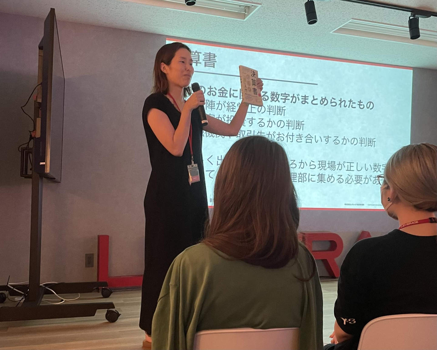 (↑社員全員が集まる月例会で、決算書について説明しているところ)