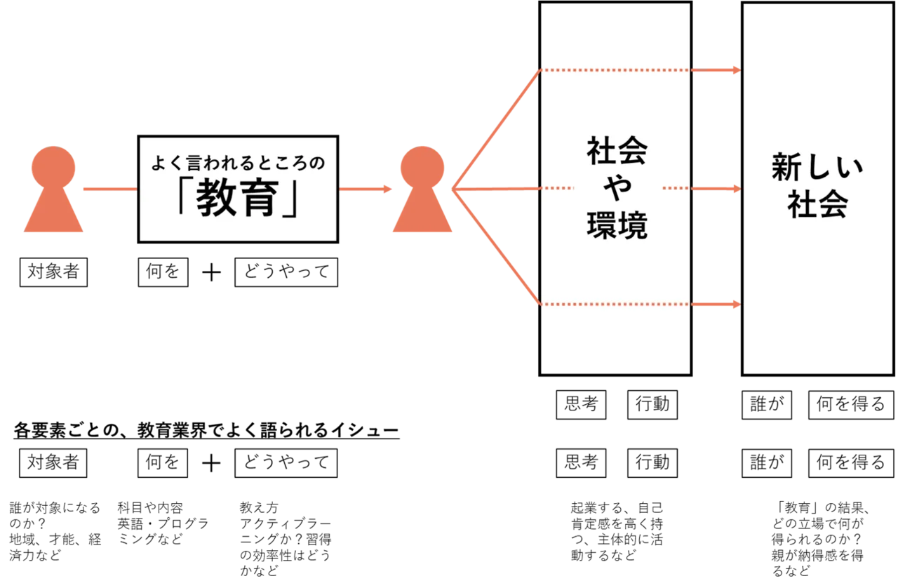 人に作用する活動、つまり誰に何をどう教えるという範囲よりさらに広範囲の意味での「きょういく」はこれだけの変数の中で語られています。よくイベントやテレビなどで見る教育談義がなかなか生産的なものにならないのは、議論の前提条件としてこれだけの変数を揃える必要があるからだと思います。特に、「対象者」が社会の中で「行動」「思考」した結果である、「誰が」「何を得る」ための教育なのかという部分はほとんどの場合前提が揃っていないように感じます。