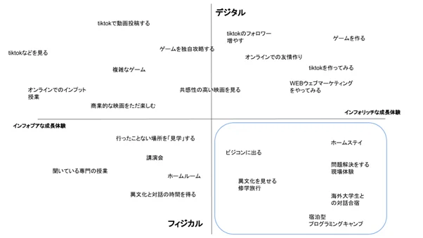 つまり、「場」を提供すると認識され、その存続を危ぶまれた教育コンテンツは、インフォリッチな体験という本質的な捉え方をした瞬間に、場を介さなければ提供できないものから、オンラインでも届けられる可能性を秘めたものに変わったというわけです。