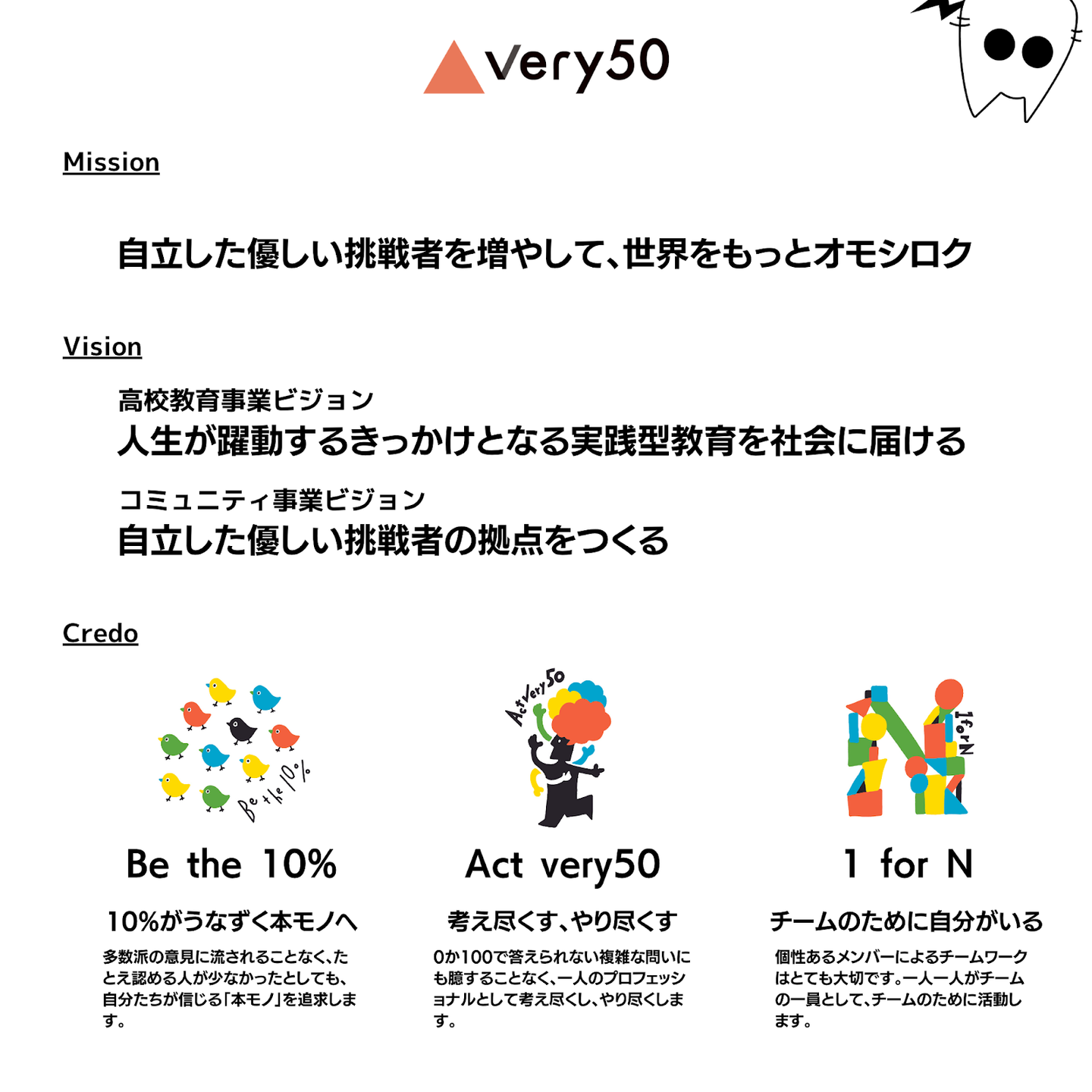 社員数こそ9人と決して多くはない団体ですが、プログラムをともに作ってくれる大学生メンター、社会人フェロー、プロボノの方々を含めると、昨年very50のプログラム運営に関わってくれた人の数は100人以上に及びました。また今年はさらに倍ほどの人々とともに、活動していくことになります。一緒に社会を変えようと奮闘してくれる仲間たちがどんどん増えていることに喜びを感じるとともに、大きくなっているチームのなかでも、それぞれにvery50が大事にしている価値観を理解してもらい、足並みを揃えてMissionを達成していきたいという思いから、very50に関わるすべてのメンバーへ向けたCredoを設定することにしました。そしてこれはvery50に関わる方々が、very50内の活動に関わってくれている間はもちろん、それ以外の時にも大切にしてほしい価値観となることを目指して議論を重ね、策定しました。