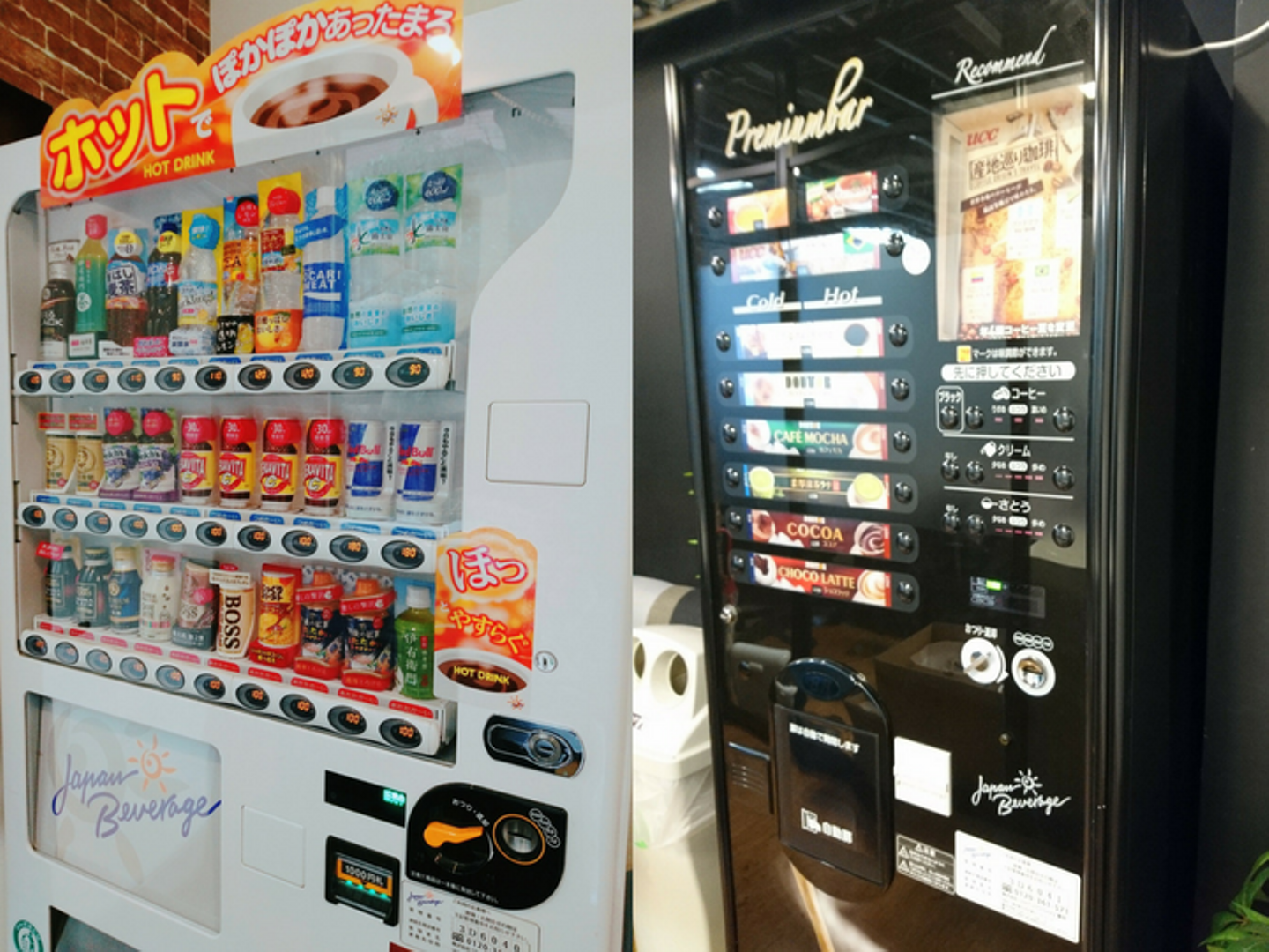 右の黒い自動販売機は、普通のコーヒーのほか、抹茶ラテやココアなども飲めます!