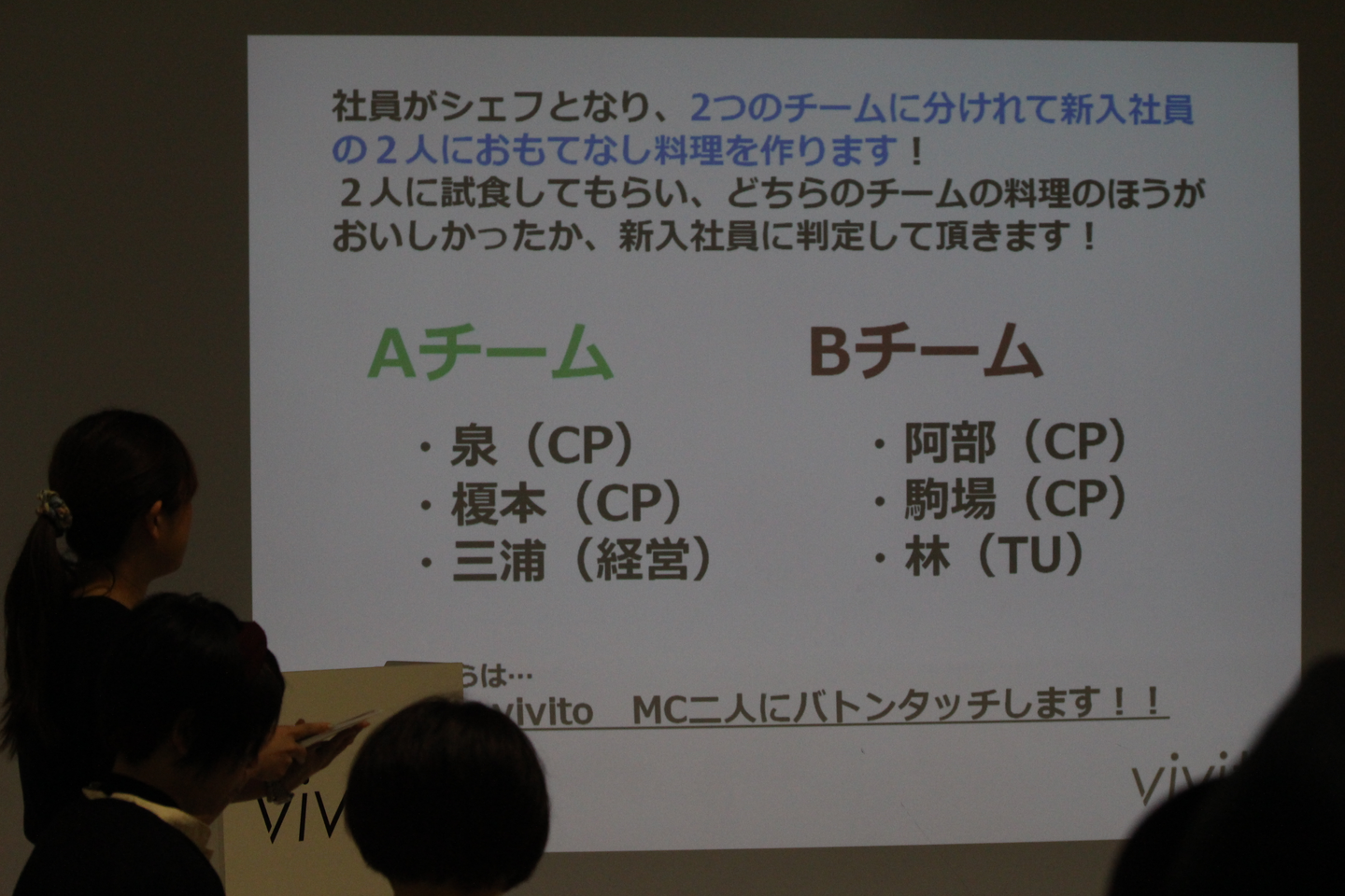 社員がシェフになって、二つのチームに分かれ、おもてなし料理を作ってもらいます。