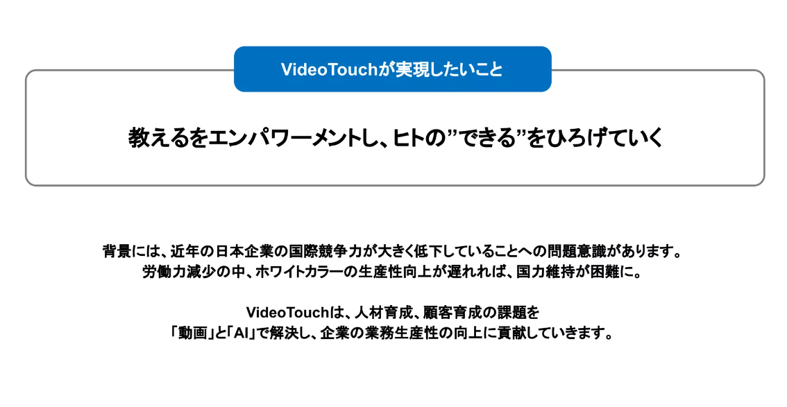 「教えるをエンパワーメントし、ヒトの“できる”をひろげていく」をコンセプトに、従業員/顧客の育成業務のDXを推進するVideoTouch。2023年7月、新たに2名の執行役員就任を発表し、さらに成長を加速していきます。